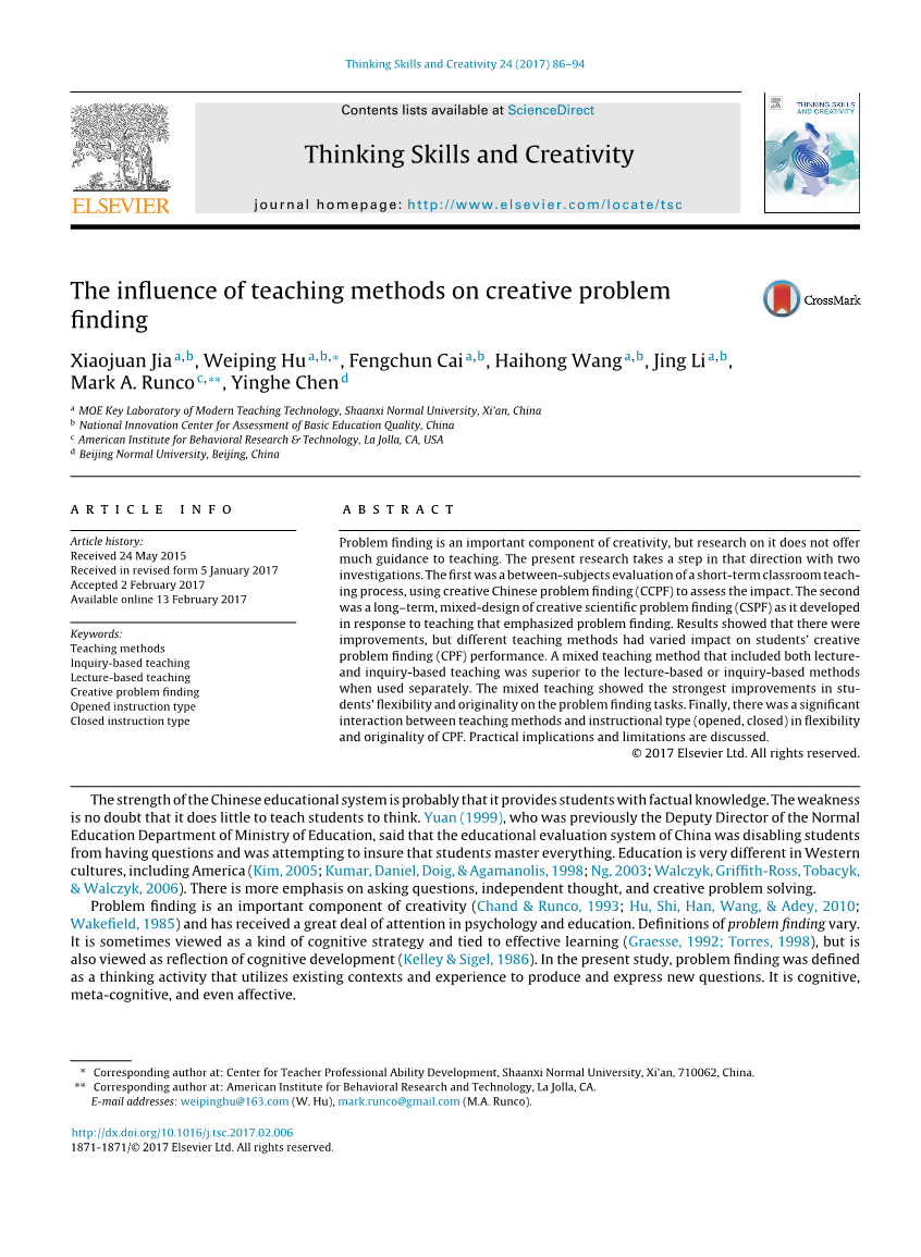 摘要:发现问题是创造力的重要组成部分,但这方面的研究没有给教学提供具体指导。目前的研究通过两个调查将朝着这一方向迈进了一步。首先是主题之间评估短期课堂教学过程,用创造性的中国问题发现(CCPF)去评估影响。第二个是一个长期的、混合设计创造性科学问题发现(CSPF), 为了应对教学强调发现问题。结果表明对创造力的发现有改进,但是不同的教学方法对学生问题发现的创造性的影响不同。混合教学方法,包括探究式教学在单独使用时是优于讲座型或基于探究的方法。混合教学最强的方面是是能改善学生找到任务时看待问题的灵活性。最后,有一个显著的作用区别教学方法和教学类型(开启,关闭)的灵活性。以下将对实际意义和局限性进行讨论。