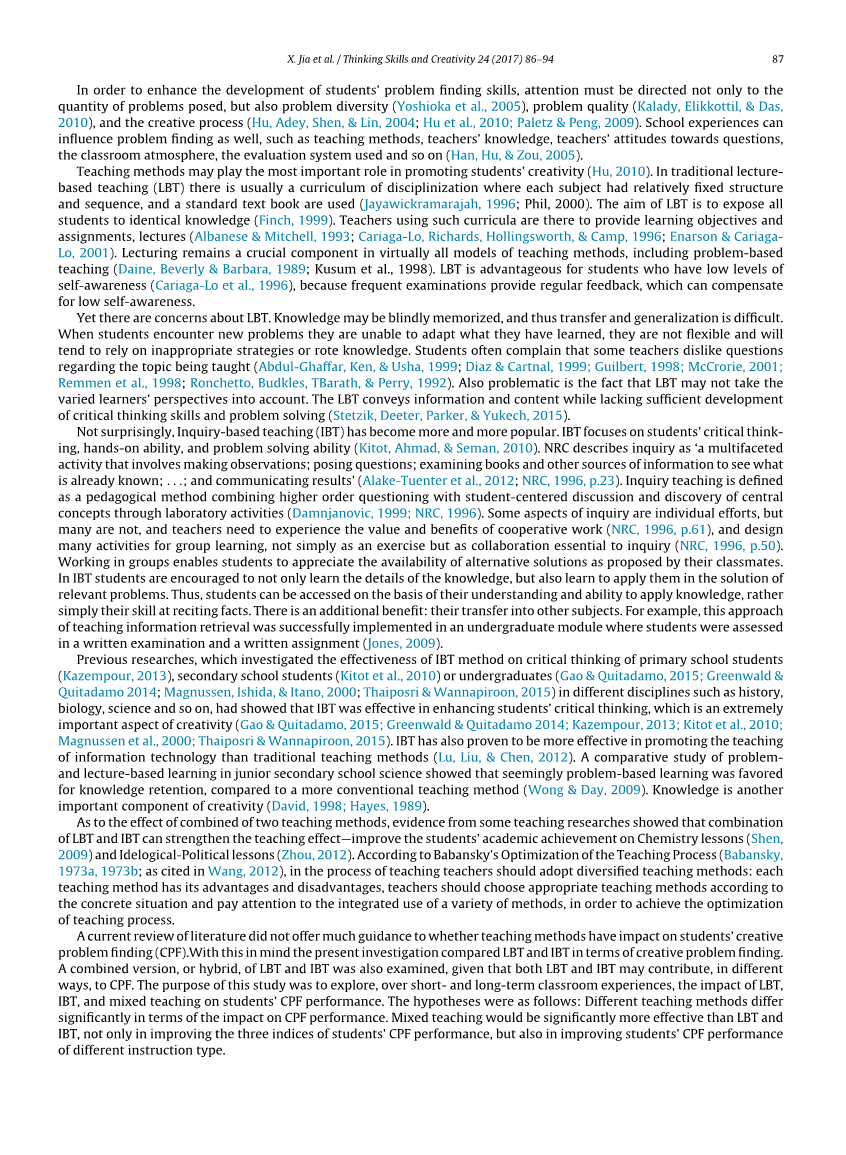 当前研究没有提供多少指导教学方法是否影响学生的创造性问题发现的证据。根据LBT和IBT创造性问题发现所合并的版本,本研究的目的是探索在短期和长期的课堂经验上LBT的影响。假设如下:不同的教学方法是不同的,明显对CPF的影响不同。混合教学法更有效。