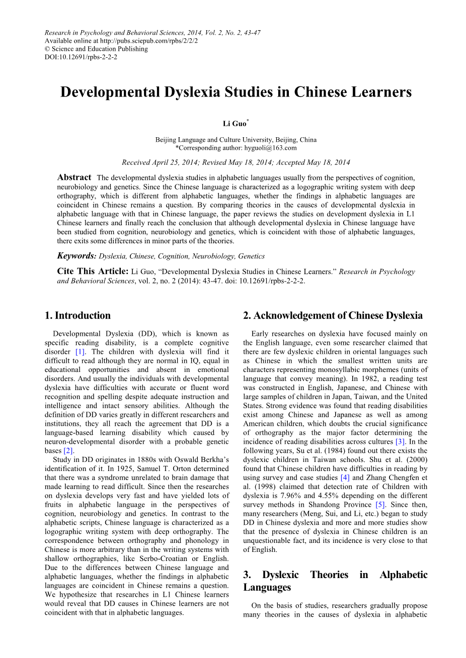 引用本文标明:李国,“汉语学习者的发展性阅读障碍研究”,Research in Psychology