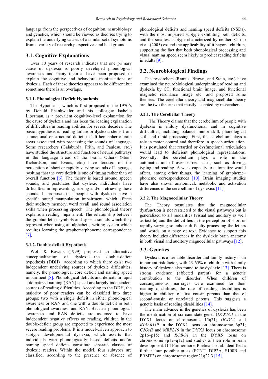 Wolf&Bowers(1999)提出了阅读障碍的另一种概念化 - 双重缺陷假说(DDH)-存在两个独立潜在的阅读困难来源,即语音核心缺陷和命名速度障碍[8]。快速命名(RAN)的语音缺陷和缺陷主要是阅读困难的独立来源。