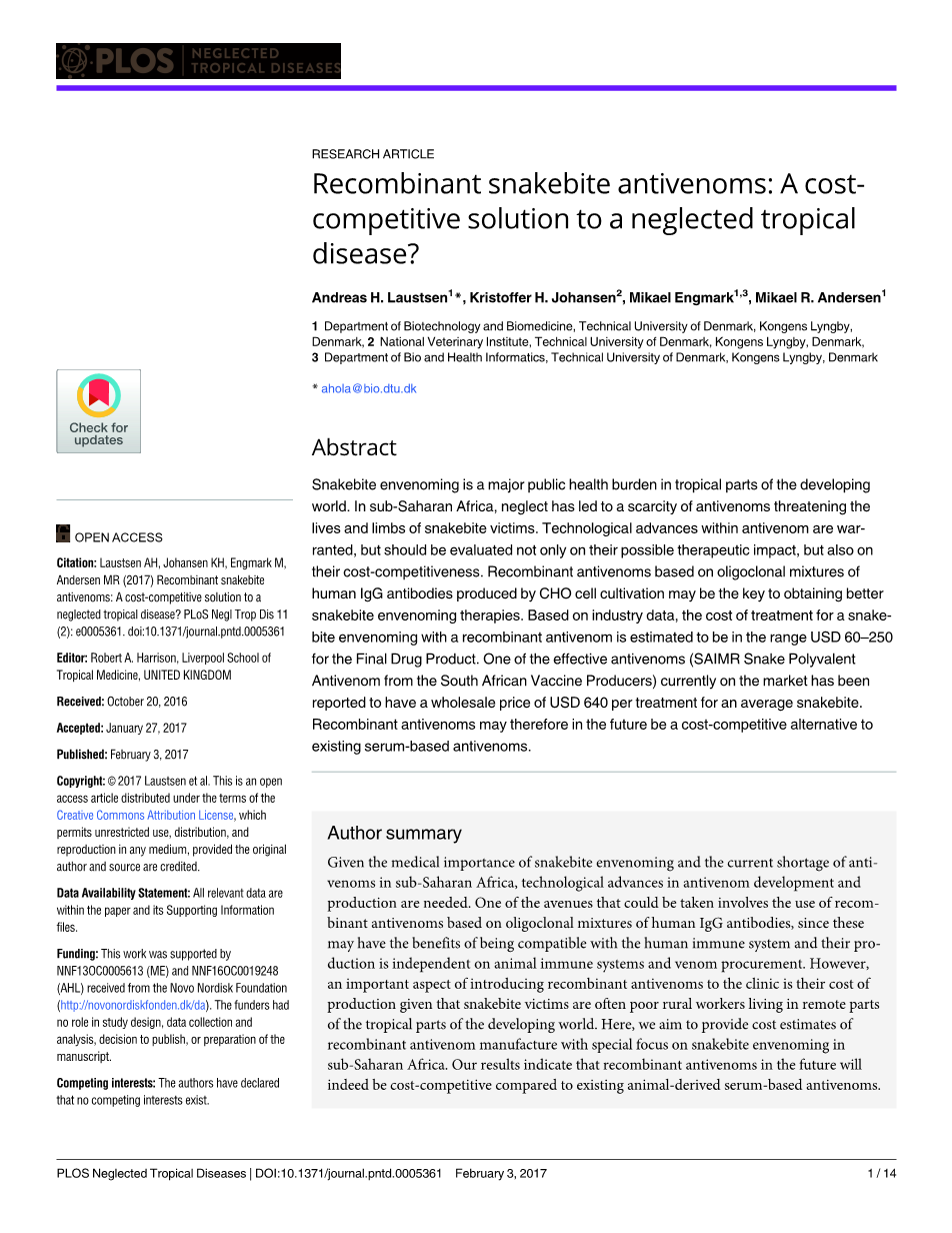 鉴于在撒哈拉以南的非洲,毒蛇咬伤的药物重要性以及目前抗蛇毒血清的短缺,需要在抗蛇毒开发和生产方面取得技术进步。可以采取的途径之一是使用基于人类IgG抗体的寡克隆混合物的重组抗蛇毒血清,因为这些抗体可能具有与人体免疫系统相适应的优势,而且它们的生产在动物免疫系统和毒液获取方面是独立的。然而,向诊所引进重组抗蛇毒血清的一个关键问题是它们的生产成本,因为毒蛇咬伤的受害者往往是生活在热带地区发展中国家偏远地区的贫穷的农村工人。在此,我们的目标是提供重组抗蛇毒血清制备的成本估计,特别关注撒哈拉以南非洲地区的蛇咬伤。我们的研究结果表明,与现有的基于动物的抗蛇毒血清相比,在未来重组抗蛇毒血清确实具有成本竞争力。此外,我们还概述了不同的生产策略,并建议使用辛酸沉淀作为一种低成本的纯化方法,随后由于在目前抗蛇毒制备中使用需要培养CHO细胞用于抗体表达。