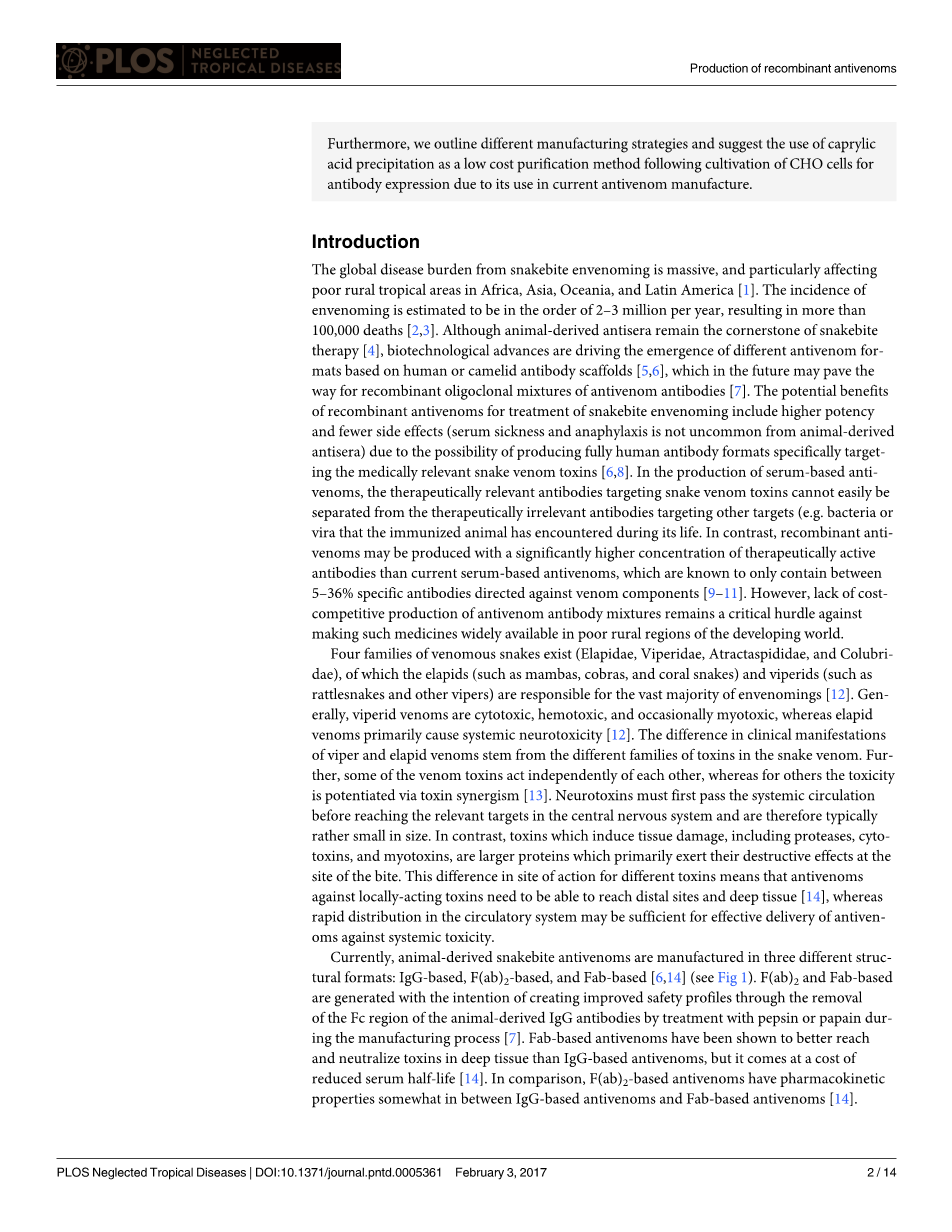 在全球有大量被毒蛇咬伤引起的疾病负担,尤其影响非洲、亚洲、大洋洲和拉丁美洲的贫穷的农村地区。毒蛇咬伤的发生率估计为每年2-3百万次,造成10万多人死亡。虽然动物衍生的抗血清仍然是蛇咬伤治疗的基石,但生物技术的进步推动了基于人类或新型骆驼抗体支架的不同的抗蛇毒血清的出现,这可能为未来重组抗蛇毒抗体的寡克隆混合物铺平道路。重组抗蛇毒血清用于治疗蛇毒的潜在好处包括,由于可能产生完全针对医学相关蛇毒毒素的全人类抗体的可能性(血清疾病和过敏反应在动物衍生的抗血清中并不罕见),因此具有更高的效力和更少的副作用。在血清型抗蛇毒血清的生产中,针对蛇毒毒素的治疗相关抗体不能很容易地与针对其他目标的治疗无关的抗体分离(例如,免疫动物在其生命中遇到的细菌或病毒)。相比之下,重组抗蛇毒血清可以产生比目前血清型抗蛇毒血清显著更高的治疗活性抗体浓度,已知仅含有5-36%的针对毒液成分的特异性抗体。然而,在发展中国家贫穷的农村地区,抗蛇毒抗体混合物的生产缺乏成本竞争的生产仍然是一个关键的障碍。