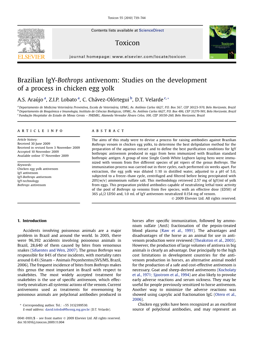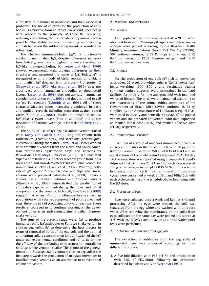 使用IgY对动物毒液的研究始于Talley 和Carroll使用响尾蛇和蝎子。此后不久,Carroll等人研究北美和南美地区的响尾蛇蝮蛇、竹叶青中减毒的毒液。后来, Maya Devi等人使用来自印度的毒蛇毒液。另外一组来自印度的研究小组使用原油和非脱毒锯鳞蝰蛇毒免疫鸡。最近,制备出了对非洲眼镜蛇科和蝰蛇科蛇毒的多价IgY。以前对巴西矛头蝮和响尾蛇属的蛇毒进行研究表明有能中和有毒致病成分抗体的产生。虽然 Sevcik等人表明当IgY作为免疫疗法作用于食用家禽和蛋类食物的人群,会产生不良反应,这些结果促使我们继续对巴西矛头蝮蛇的毒液的禽抗毒蛇血清发展的研究。