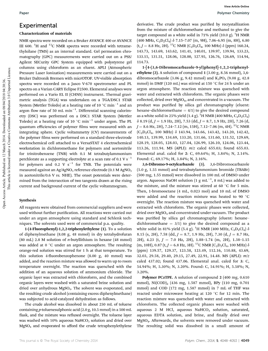 核磁共振波谱记录用Bruker AVANCEAVANCE 400或AVANCEIII 600。用四甲基硅烷作为内标记录1H和13C核磁共振谱。凝胶渗透色谱测量在配备聚苯乙烯凝胶柱的PSS /安捷伦安全凝胶色谱系统上进行,使用氯仿作为洗脱剂。大气压力激光电离测量用Bruker Daltronik Bremen切片机。紫外-可见吸收光谱记录用Jasco V-670光谱仪,荧光光谱记录用Varian CARY Eclipse F2500。元素分析用Vario EL仪器进行。热重量分析用TGA/DSC1 STARSystem (Mettler Toledo)进行分析( TGA ),加热速率为100C min-1,流速为50 mL min-1.差示扫描量热法是在差示扫描量热系统(梅特勒托莱多),氩气下,加热速率为10℃ min-1。用积分球测量了聚合物薄膜的光致发光量子效率。聚合物膜的循环伏安法( CV )测量是在标准的三电极电化学电池上进行的,该电池连接到VersaSTAT 4电化学工作站,聚合物用二氯甲烷,三硝基苯(TNB )用乙腈,0.1 M高氯酸四丁基铵作为电解质,扫描速率对于聚合物为0.1 V s-1,对于TNB为0.2 V s-1。用银/硝酸银参比电极测量电位(乙腈中0.1硝酸银/0.6V vs. NHE) )。起始电位由上升时绘制的两条切线的交点确定循环伏安图的电流和本底电流。合成