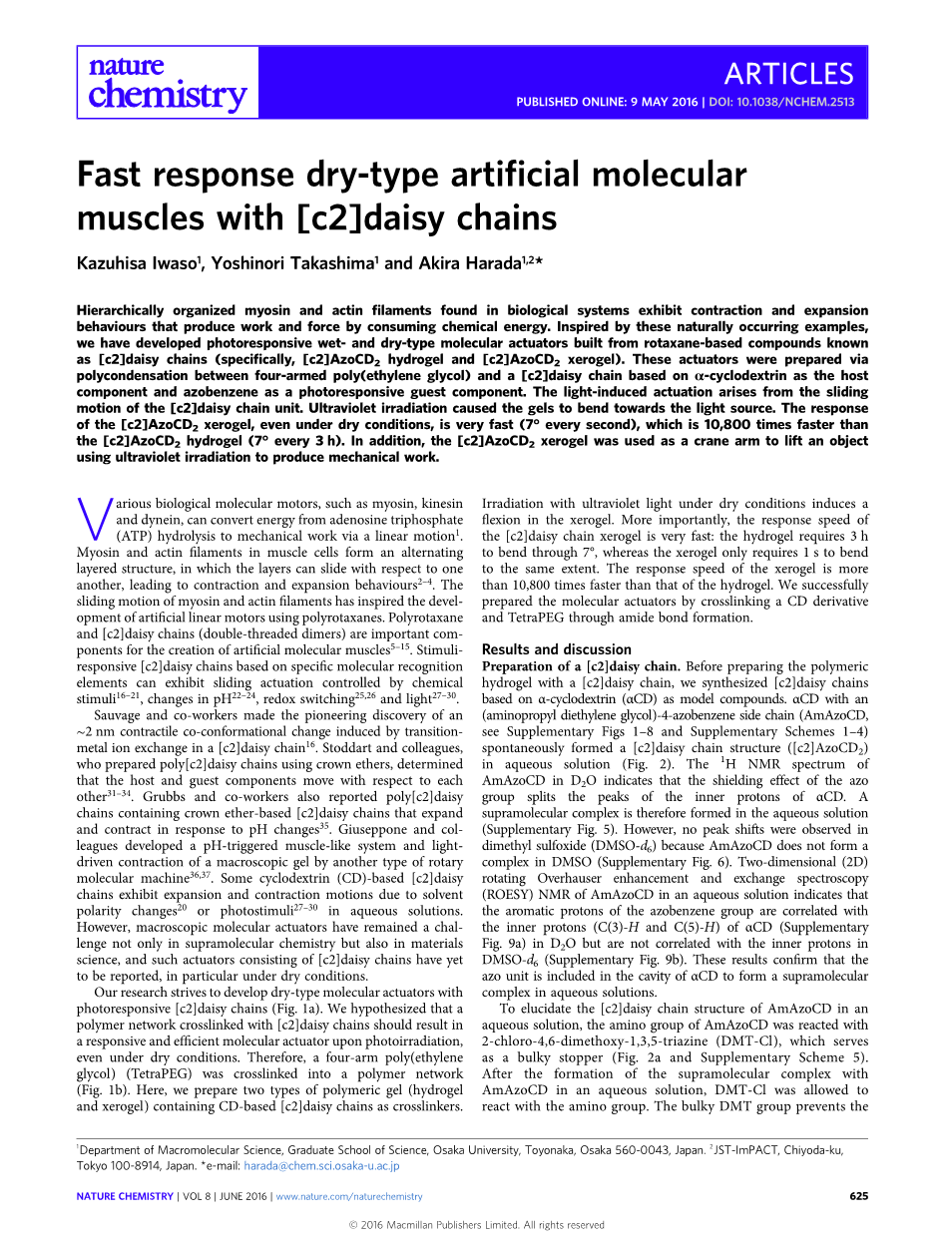 制备[c2]雏菊链。 在制备具有[c2]雏菊链的聚合物水凝胶之前,我们合成[c2]基于alpha; -环糊精(alpha; CD)的雏菊链作为模型化合物。 (氨基丙基二甘醇)-4-偶氮苯侧链(AmAzoCD,见补充图1-8和补充方案1-4)自发形成[c2]雏菊链结构([c2] AzoCD2)解(图.2)。D2O中AmAzoCD的1H NMR谱表明偶氮基团的屏蔽作用分裂了alpha; CD的内质子的峰。 因此在水溶液中形成超分子复合物(补充图5)。 然而,由于AmAzoCD不能在DMSO中形成配合物(补充图6),所以在二甲基亚砜(DMSO -d6)中没有观察到峰位移。 AmAzoCD在水溶液中的二维(2D)旋转质子进动增强和交换光谱(ROESY)NMR表明偶氮苯基团的芳香族质子与内部质子(C(3)-H和C(5)-H)中的alpha; CD(补充图9a)(但补充图9b)与DMSO -d6中的内部质子2不相关(补充图9b)。 这些结果证明偶氮单元包含在alpha; CD的空腔中以在水溶液中形成超分子复合物。