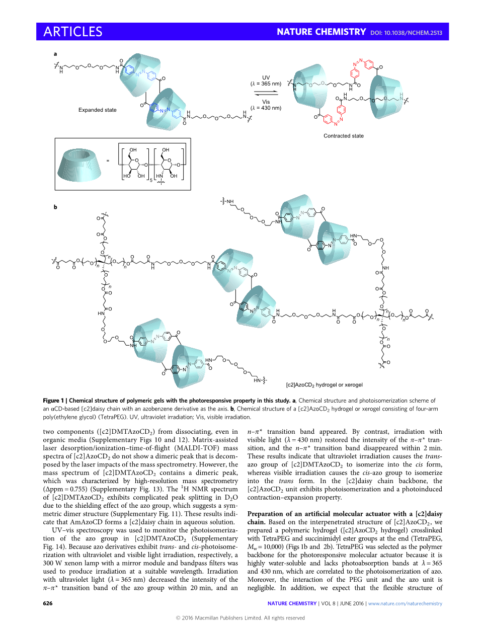图1 | 本研究中具有光响应性的聚合物凝胶的化学结构。a,以偶氮苯衍生物为轴的基于alpha; CD的[c2]雏菊链的化学结构和光异构化方案。b,由四臂聚(乙二醇)(TetraPEG)组成的[c2] AzoCD22水凝胶或干凝胶的化学结构。 紫外线,紫外线照射; 可见光照射。
