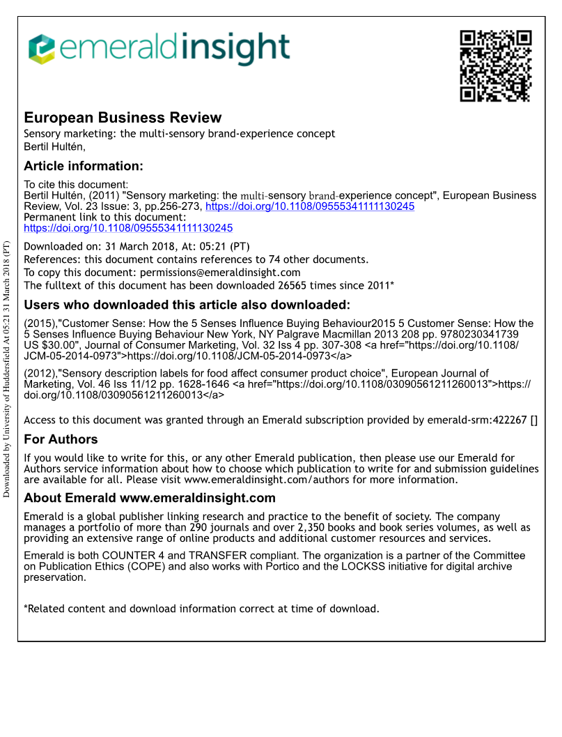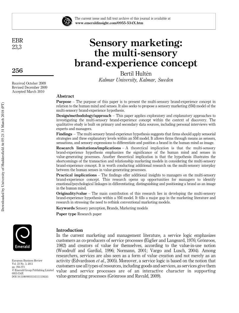 应该指出的是,对多感官品牌体验概念的研究仍处于起步阶段。本文提供了SM模型中多感官品牌体验概念的探索性概述,该模型对常规营销模式提出质疑。