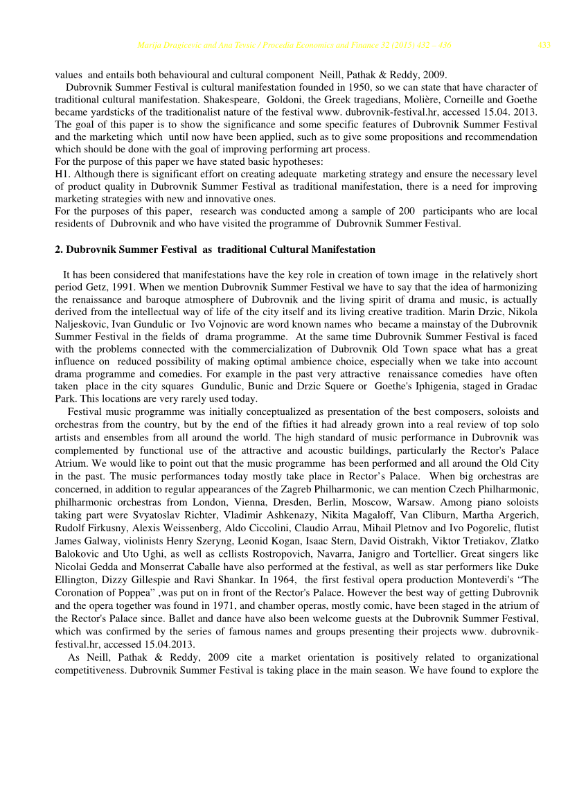 杜布罗夫尼克夏节是在1905年建立的表演形式,因此我们就可以说它是具有传统文化表现的特征。莎士比亚,戈多尼,希腊悲剧家,莫利埃,考尼尔和歌德成为了传统传统节日性质的标尺。www.dubrovnik-festival.hr,访问15.04。2013。本文的目的是展示杜布罗夫尼克夏季节的意义和一些具体的特点,以及以及迄今为止已经应用的市场营销,如提出了一些以改进表演艺术过程为目标的命题和推荐。为了这篇论文的目的,我们提出了基本假设:H1:尽管在杜布罗夫尼克夏季节期间,我们已经做出了大量努力,制定了适当的营销策略,并确保了产品质量的必要水平作为传统表现形式。 同时,有必要用新的和创新的营销战略来改进营销战略。为了本论文的目的,对200名当地居民进行了研究,他们参与了杜布罗夫尼克夏季节的活动内容。