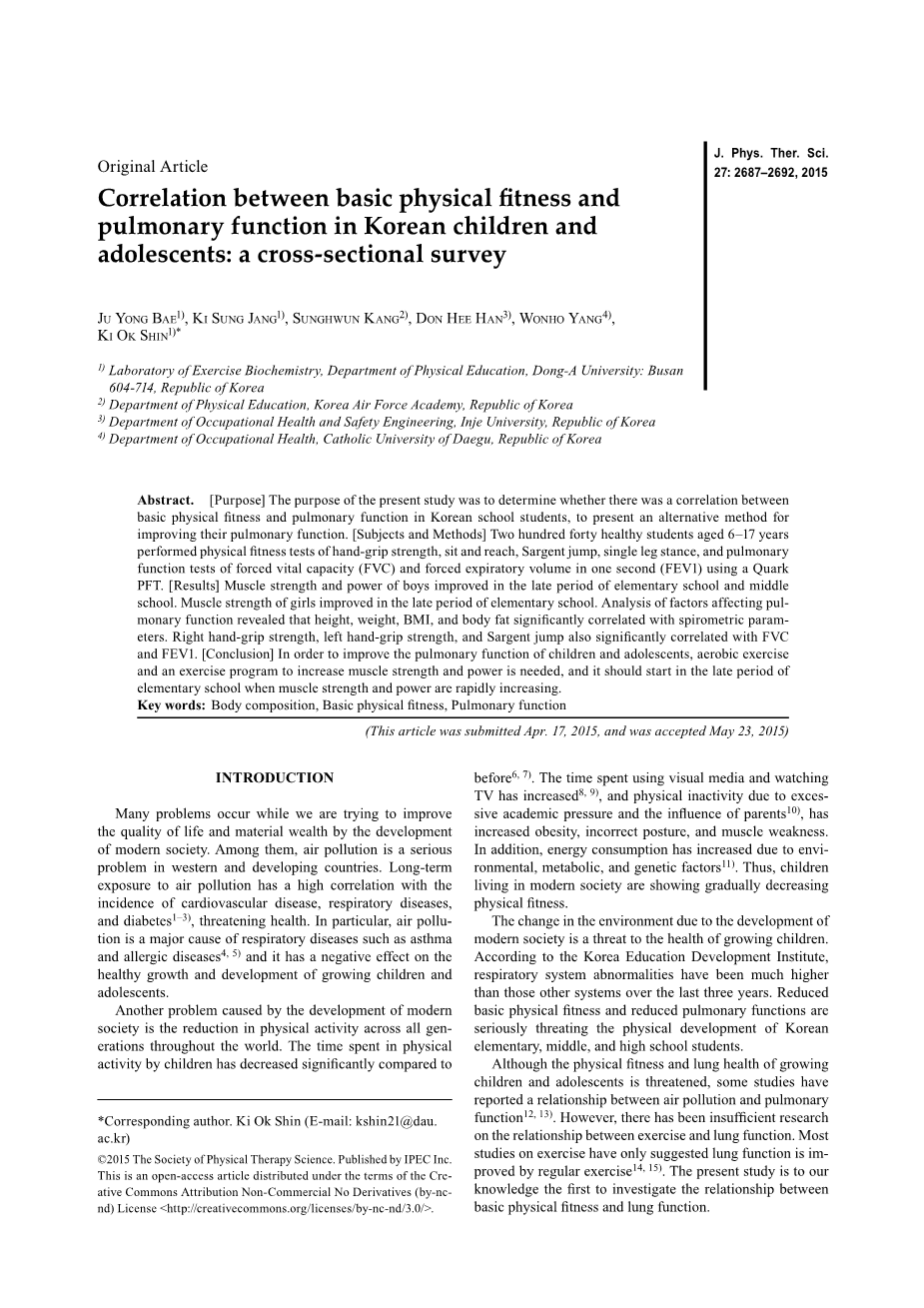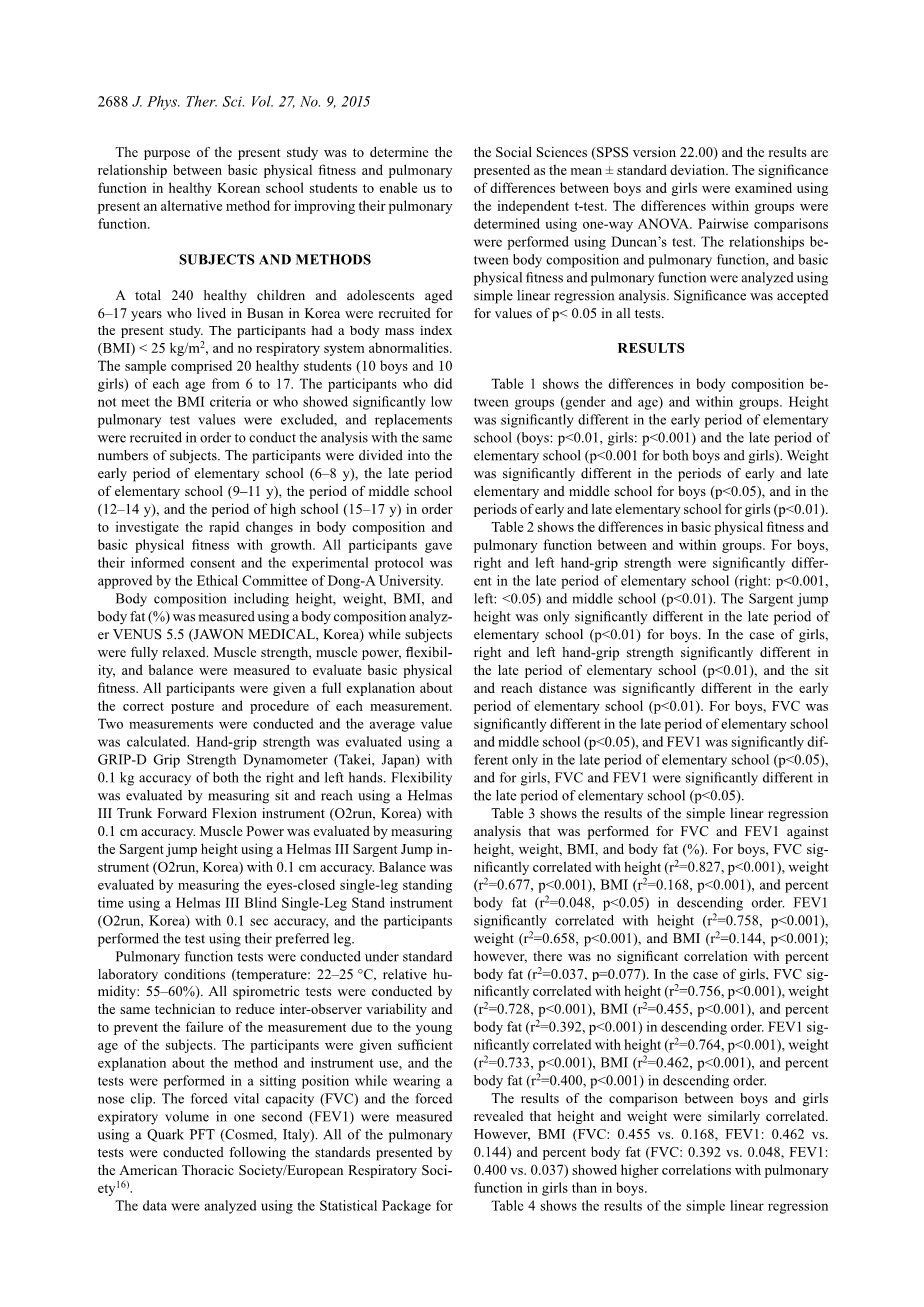 本研究旨在探讨健康的韩国学生的基本体质与肺功能之间的关系,为我们提供一种改善其肺功能的替代方法。