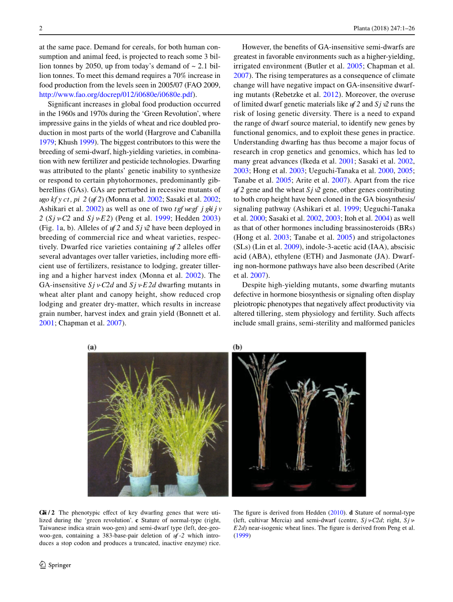 20世纪60年代和70年代,“绿色革命”期间,全球粮食产量显著增加,世界大部分地区的小麦和水稻产量翻番(Hargrove和Cabanilla,1979;Khush,1999)。促成这一结果的最大因素是结合新的化肥和农药技术培育了半矮秆、高产品种。矮化是由于植物的基因不能合成或对某些激素主要是赤霉素(GAs)作出反应。赤霉素在semi dwarfing 1(sd1)隐性突变体(Monna等,2002;Sasaki等,2002;Ashikari等,2002)和两个reduced height 1(Rht-B1和Rht-D1)(Peng等,1999;Hedden,2003)中的一个受到干扰(图1a,b)。sd1和rht1等位基因已分别应用于水稻和小麦品种的育种。含有sd1等位基因的矮秆水稻品种比高的品种具有一些优势,包括更有效地使用肥料、抗倒伏、更大的分蘖和更高的收获指数(Monna等人,2002)。小麦中对GA不敏感的rht-B1b和rht-D1b矮秆突变体改变了植株和冠层高度,降低了作物倒伏率,增加了干物质、籽粒数、收获指数和产量(Bonnett等,2001;Chapman 等,2007)。