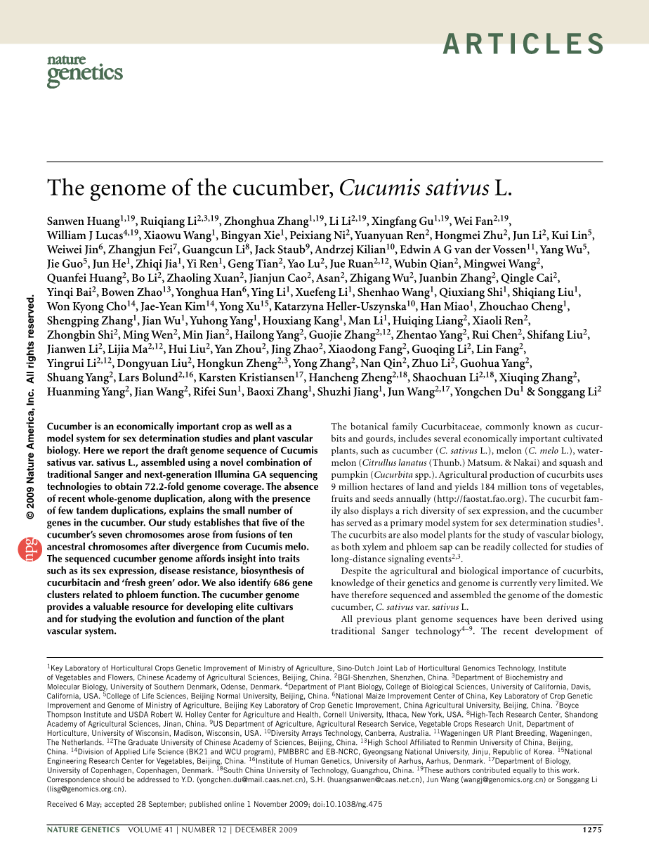 尽管瓜类在农业和生物学上都很重要,但目前对于它们的遗传学和基因的了解非常有限。因此我们测序了家养黄瓜(C. sativus var. sativus L.)的基因组。