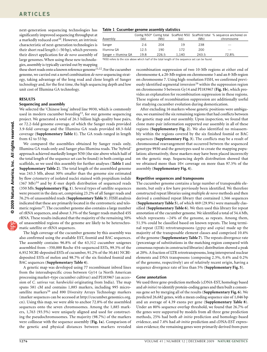 我们比较了用Sanger阅读,Ⅰllumina GA阅读和二者结合阅读获得的组装集。二者结合的方法在重叠群和支架方面,明显获得了更长的N50(上面列出的序列总长度一半的尺寸可以找到)。所以,我们用这个组装结果做进一步的分析(表1和补充表2)。基因组组装的总长度是243.5Mb,比通过流式细胞仪用碘化丙啶染色分离细胞核(367Mb)[14]估计的和通过K-mer深度分布的测序阅读(350Mb;补充图1)的基因组长度小了约30%。数据集中发现了几种类型的卫星序列,包括23.2%的Sanger 阅读和76.2%未组装阅读(补充表3)。荧光原位杂交分析表明,这些序列主要位于着丝点和端粒区[15]。黄瓜基因组也包含大量的rRNA序列,约3.3%的Sanger阅读匹配45SrRNA。这些结果表明,其余30%的基因组未组装区域大部分可能是异色的卫星序列或rRNA序列。