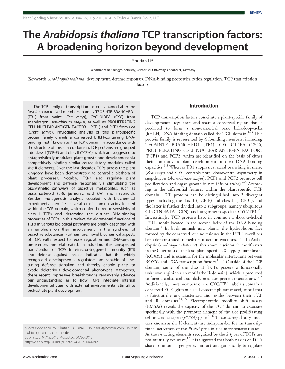关键词:拟南芥; 发育; 防御反应; DNA结合特性; 氧化还原调节;TCP转录因子