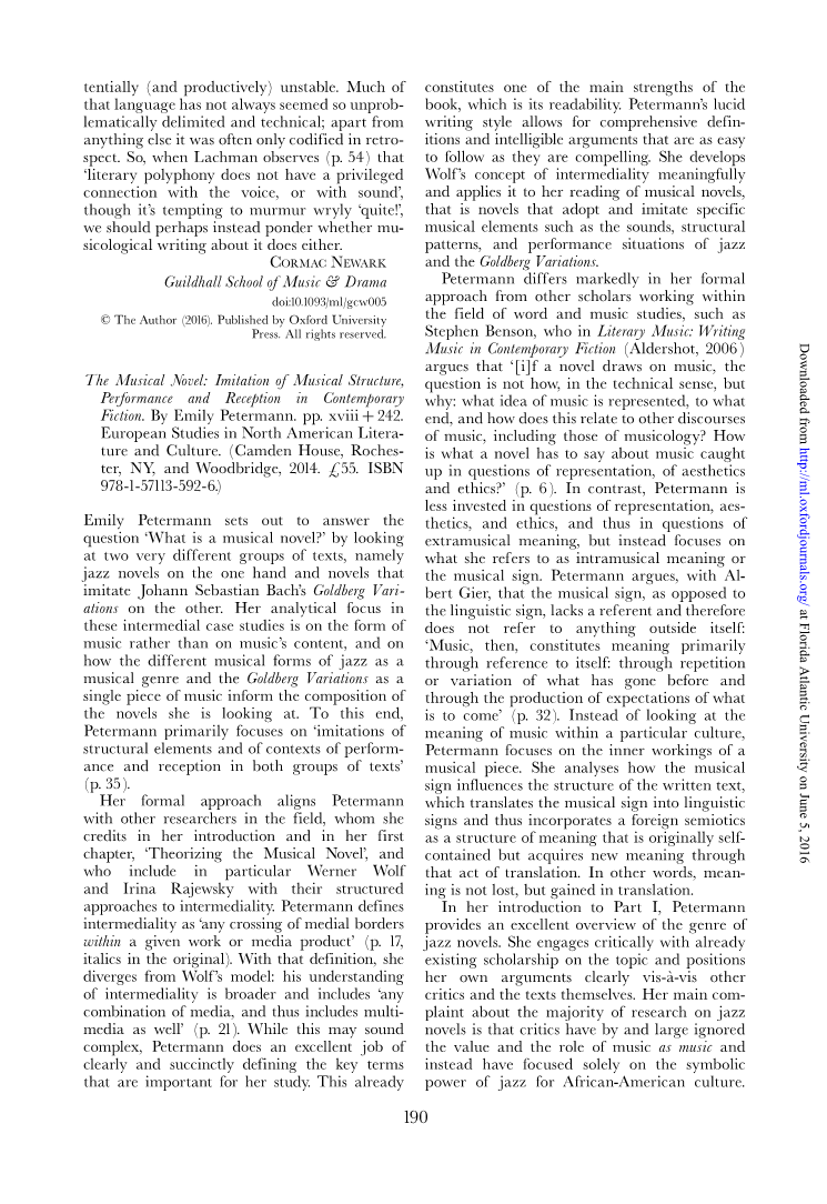 constitutes one of the main strengths of the book, which is its readability. Petermannrsquo;s lucid writing style allows for comprehensive definitions and intelligible arguments that are as easy to follow as they are compelling. She develops Wolfrsquo;s concept of intermediality meaningfully and applies it to her reading of musical novels, that is novels that adopt and imitate specific musical elements such as the sounds, structural patterns, and performance situations of jazz andthe GoldbergVariations. Petermann differs markedly in her formal approach from other scholars working within the field of word and music studies, such as Stephen Benson, who in Literary Music:Writing Music in Contemporary Fiction (Aldershot, 2006) argues that lsquo;[i]f a novel draws on music, the question is not how, in the technical sense, but why: what idea of music is represented, to what end, andhowdoesthisrelateto otherdiscourses of music, including those of musicology? How is what a novel has to say about music caught up in questions of representation, of aesthetics and ethics?rsquo; (p. 6). In contrast, Petermann is less invested in questions of representation, aesthetics, and ethics, and thus in questions of extramusical meaning, but instead focuses on what she refers to as intramusical meaning or the musical sign. Petermann argues, with Albert Gier, that the musical sign, as opposed to thelinguistic sign, lacks a referent andtherefore does not refer to anything outside itself: lsquo;Music, then, constitutes meaning primarily through reference to itself: through repetition or variation of what has gone before and through the production of expectations of what is to comersquo; (p. 32). Instead of looking at the meaning of music within a particular culture, Petermann f