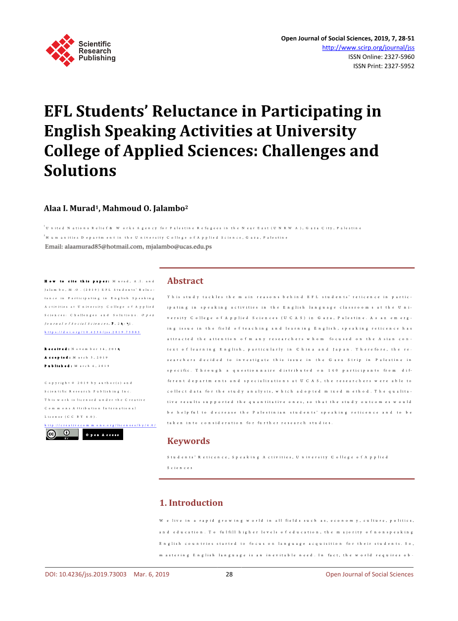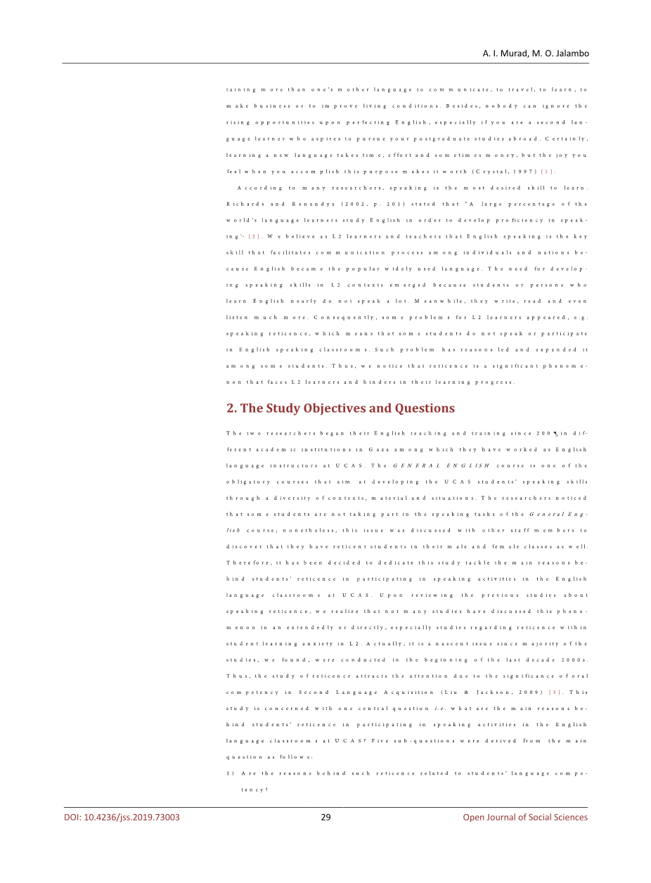 这两位研究人员从2005年开始在加沙的不同教育机构进行英语教学和培训。其中,他们还曾在UCAS担任英语教师。通识英语课程是UCAS的必修课程之一,旨在通过多种语境、材料和情境来培养学生的口语能力。研究人员注意到,一些学生没有参与普通英语课程的口语任务;尽管如此,他们还是就这个问题与其他工作人员进行了讨论,结果发现他们的男性和女性班级都有沉默寡言的学生。因此,本研究决定致力于解决学生在UCAS英语课堂中不愿参与口语活动的主要原因。回顾以往关于言语缄默的研究,我们发现很少有研究直接或间接地探讨这一现象,尤其是关于第二语言学习焦虑中的缄默现象的研究。事实上,这是一个新生的问题,因为我们发现,大多数的研究都是在本世纪初进行的。因此,对沉默的研究由于口语能力在第二语言习得的重要性而受到关注 (Liu amp; Jackson, 2009)。本研究关注的一个中心问题,即在UCAS的英语课堂中,学生不愿参与口语活动而沉默的主要原因是什么?主要问题又衍生出以下五个子问题: