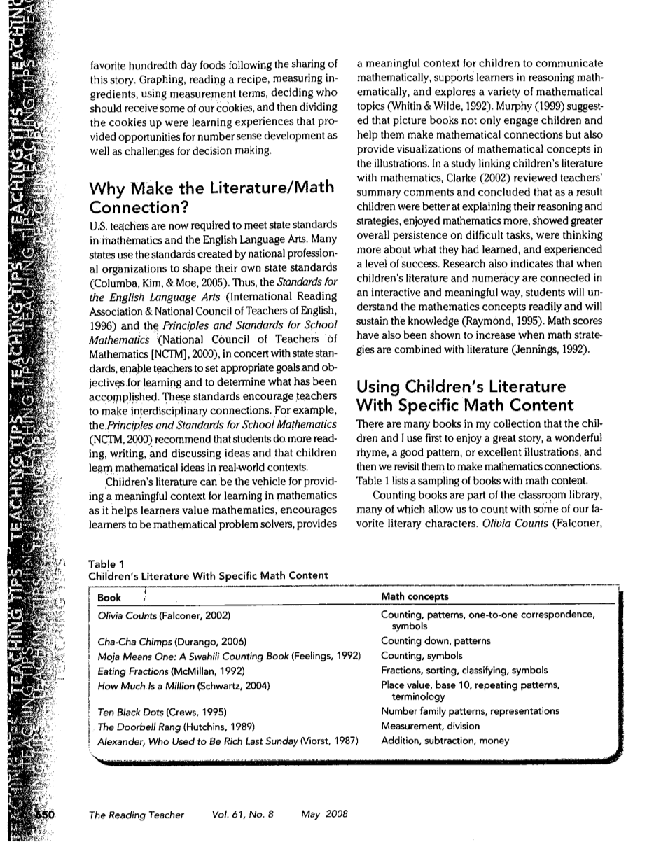 对于教师来说,重要的是,不仅要选择优秀的儿童文学作品与学生分享,而且要帮助学生与他们的生活和其他内容领域建立联系,同时从这些书中建构意义(Hyde, 2006)。当还选择了那些朗读的选择来发展数学思想时,数学就变得人性化,强调与艺术的关系,图画书和推广活动会激发儿童的积极反应,兴趣,享受和信心(Lawrence, Hope, Small, amp; Martin, 1996 as cited in Columba et al., 2005)。Hyde(2006)建议教师在与儿童文学的互动以及与源自这些文本的数学联系的互动中,使用经过时间考验的理解策略进行提问,建立联系,形象化,推断,预测,确定重要性和合成。