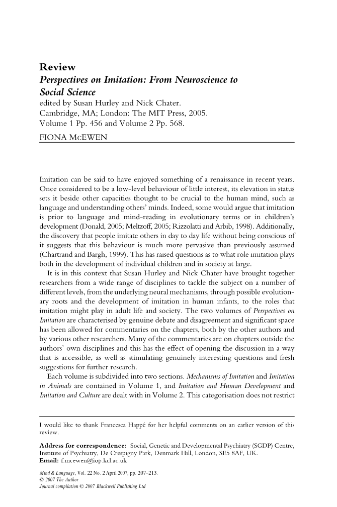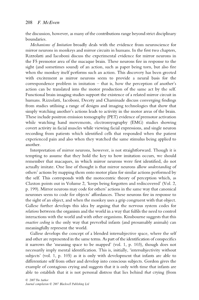盖勒斯发展了一个混合的主体间空间的概念,在这里,自我和他者以相同的术语来表现。作为conspecifi识别的一部分,它缩小了“要映射的意义空间”(vol。(第103页),但这并不一定意味着精神上的认同。这就是最初的“没有主体的主体间性”(卷)。1,第105页),因为只有随着发育,婴儿才能够将自我与他人区分开来,发展成有意识的主体。戈登给出了传染性哭泣的例子,并建议说,只有随着时间的推移,婴儿才能确定哭泣背后的不是个人痛苦另一个)。琼斯同意镜像神经元是一种机制的观点对他人行为的自动的、非个人的、非命题的识别和理解。可以为理解意图奠定基础,而意图又是模仿所必需的。总之,镜像神经元似乎是必要的,但对模仿来说还不够。