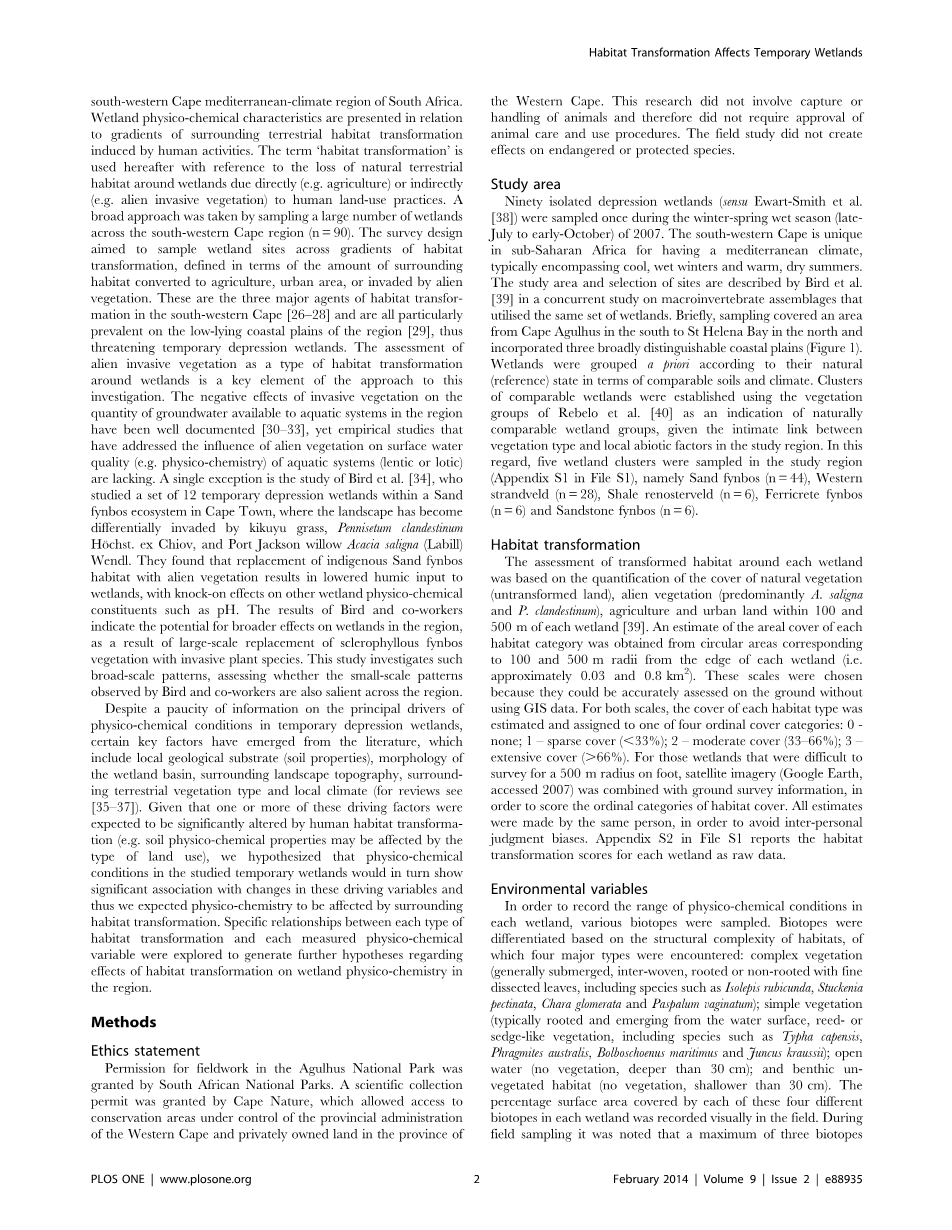 本研究评估南非西南部开普敦的地中海气候区临时湿地的人文景观改造及相关的湿地的物理化学特性的改变的程度和本质。湿地的理化特性呈现在跟周围的人类活动引起的陆地生境改造的梯度性的关系上。“栖息地改造”这个名词是参照围绕在湿地周围的自然陆地栖息地直接(如农业)或间接(如外来入侵植物)的因为人类土地利用方式而丧失以后才使用的。在西南部开普敦地区(N =90),一个方法被广泛地应用在抽检大量的湿地中。本次调查设计的目的是抽检所有栖息地改造梯度的湿地网络,这由周围栖息地转化为农用地、城事用地或被外来物种入侵的土地的数量来确定。这些都是在西南部开普敦[26-28]关于栖息地改造的三大代表性湿地并且在该地区的[29]低洼的沿海平原尤为普遍,因此威胁着临时性湿地。对于作为栖息地改造类型其中一种的外来入侵植物的评定是该方法对本次调查的一个关键要素。侵入植被对可用在该区域水生系统的地下水量的负面影响已经有据可查[30-33],这已经解决了外来植被对水生生态系统(静水或激流)地表水水质(e.g.physico-化学)的影响,但实证研究尚缺乏。一个单独的例外是伯德等人的研究[34],一个学习了一组在开普敦沙凡波斯生态系统中的12个临时湿地,那里的景观已不同程度的被东非狼尾草入侵了,Pennisetum clandestinum Hochst. ex Chiov, and Port Jackson willow Acacia saligna (Labill) Wendl。他们发现,更换本土的沙凡波斯栖息地的外来植物会导致降低胡敏进入到湿地,并造成连锁的对于其他湿地物理-化学成分的影响,如pH值。Bird及其同事的结果表明了用侵袭性植物物种大规模置换硬叶凡波斯植被的结果就是会对该地区的湿地形成更广泛影响力的潜力。本研究探讨这种大规模的模式,来评估由伯德和他的同事观察到小规模的模式是否也是在该地区突出。