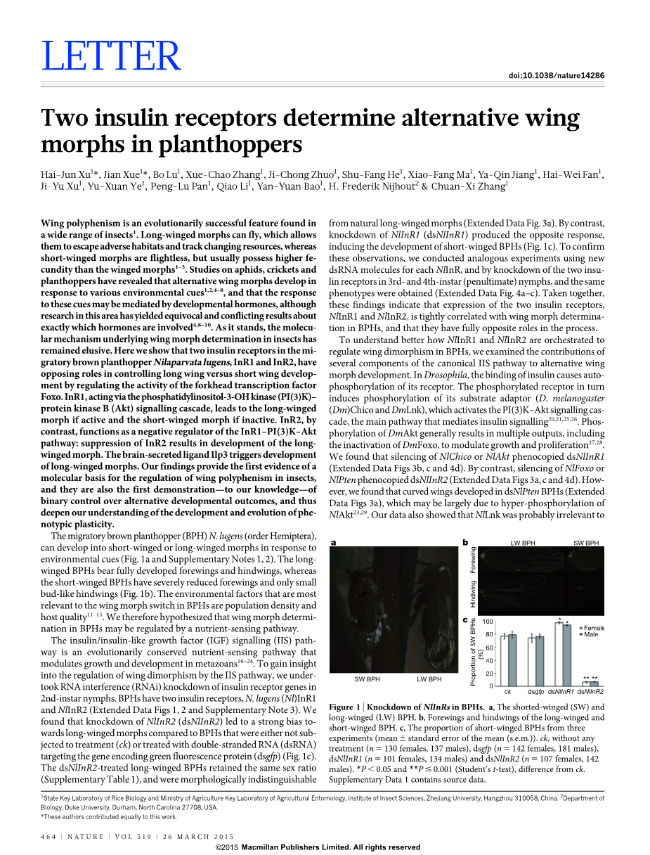 摘要:在广泛的昆虫中翅多型是一种进化成功的特征发现[1]。长翅型褐飞虱具有飞行能力,这能让他们逃离不利的生境和轨道变化的资源,而短翅型褐飞虱丧失飞行能力,但通常相比于翅型分化具有较高的繁殖力[1-3]。研究蚜虫、蟋蟀和稻飞虱显示替代翼分化发展以应对各种环境因素[1,2,4-8],而这些线索的反应可能都是通过发育激素介导的,尽管在这一领域究竟与哪些激素有关的研究已经产生了模棱两可和冲突的结果[4,8-10]。目前,昆虫的翅型分化分子机制的测定仍然遥遥无期。在这里,我们表明在迁徙褐飞虱INR1和INR2体内的两个胰岛素受体,有通过调节叉头转录因子Foxo的活性控制长翅和短翅发育的相反作用。INR1,通过磷脂酰肌醇-3-羟基激酶/蛋白激酶B(PI(3)K-Akt)信号级联诱导长翅型飞虱产生,如果这条通路被抑制,则诱导短翅型飞虱产生。与INR1相反,INR2作为INR1-PI(3)K-Akt的负调控途径:抑制这条通路诱导长翅型飞虱产生。大脑分泌的配体Ilp3诱导长翅型飞虱的产生。我们的发现提供了昆虫中首次证明翅型分化分子基础的研究,他们也是我们在替代发展成果二进制控制学科的第一个示范,因而加深我们对发展和进化的表型可塑性认识。