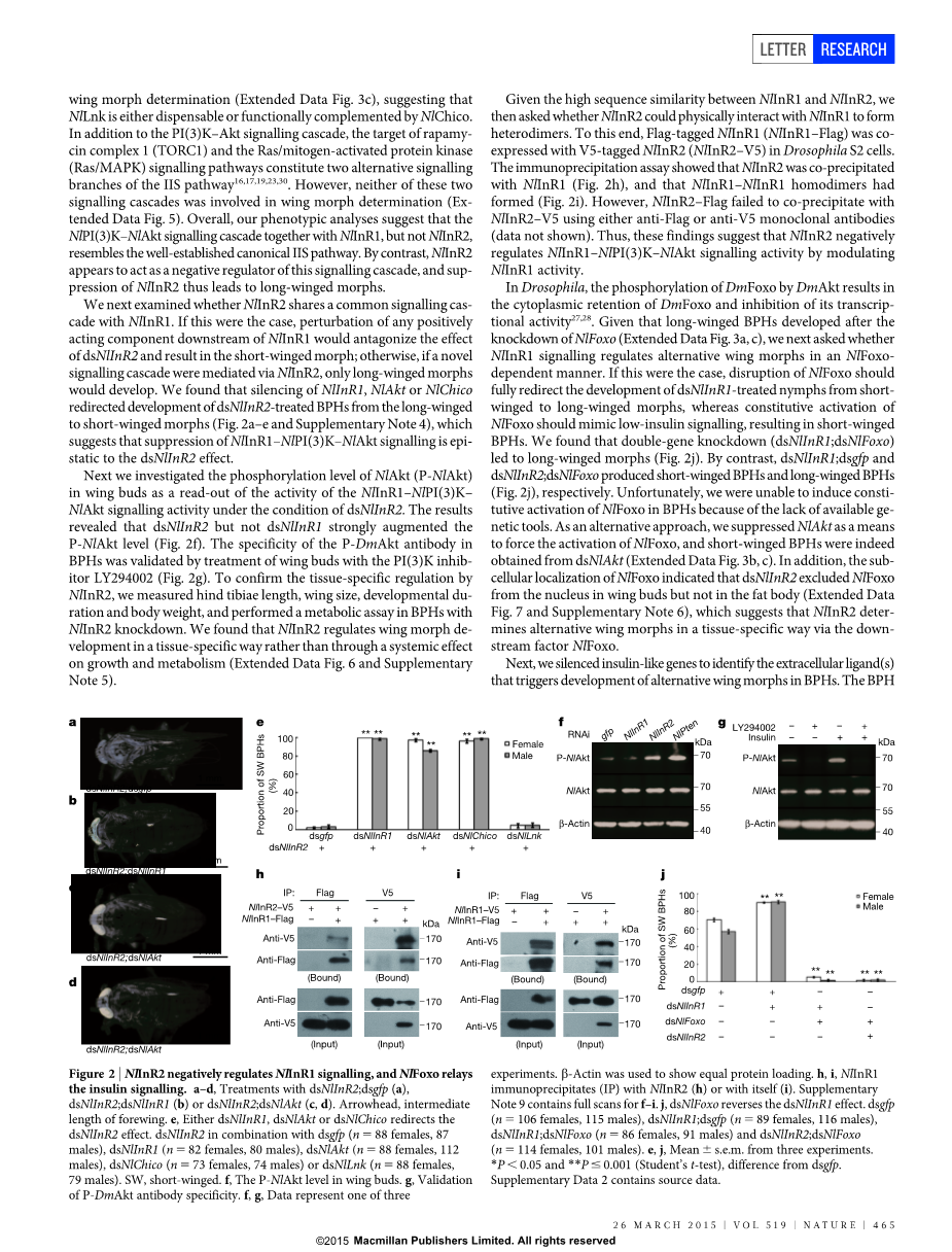 接下来我们研究了NlAkt (P-NlAkt)磷酸化水平在作为一个在dsNlInR2条件下的一个关于NlInR1–NlPI(3)K–NlAkt信号活性的读出的翅芽中。结果显示, dsNlInR2但不是dsNlInR1强烈增强了P-NlAkt的水平(图2)。褐飞虱体内的P-DmAkt抗体特异性是由用PI(3)K抑制物质LY294002处理的翅芽验证的(图2g)。通过NlInR2确认组织特异性调控,我们测量后肢胫骨长度、翅膀大小、发育历期和体重,并用敲除NlInR2的褐飞虱履行一个代谢试验。我们发现,NlInR2调节翅型分化是通过一个组织特异性的方式发展的而不是通过对生长和代谢系统的作用(扩展数据图6、补充标注5)。