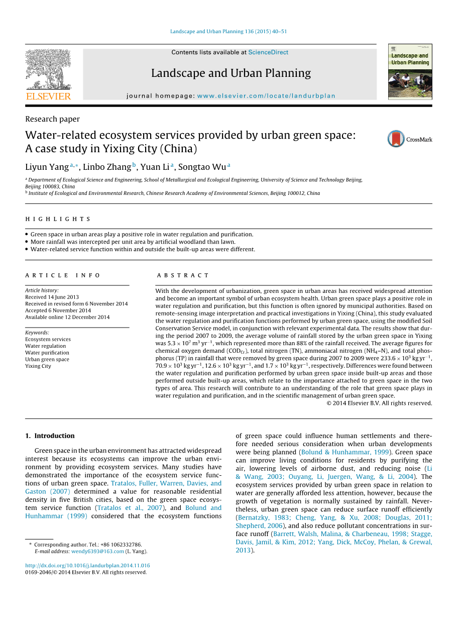 虽然由城市绿地为城市水训话提供的生态系统服务有时候会被忽视,但它们最近在水资源短缺和水污染严重地区收到了广泛的关注。杨,李,谢,张和张计算了在北京绿地对于减少地表径流的经济价值。然而,对于城市绿地提供的生态系统服务影响水供应和水质量的研究仍处于初级阶段,还未被全面阐述。