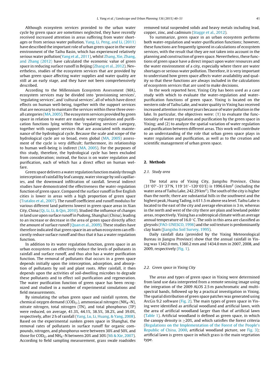 在这里的工作报告,宜兴市已被用来作为一个案例研究,用以评价绿地的水管理和水的净化功能。宜兴市地处太湖西侧,近年来由于水质污染湖泊宜兴的水质收到了更多的关注。具体而言,其目标是:(1)来评估宜兴绿地水的调节和净化功能;(2)来分析水调节和净化在不同区域间的空间变化。这项工作将有助于对城市绿地发挥水调节和净化作用的理解,以及城市绿地的创造和科学管理。