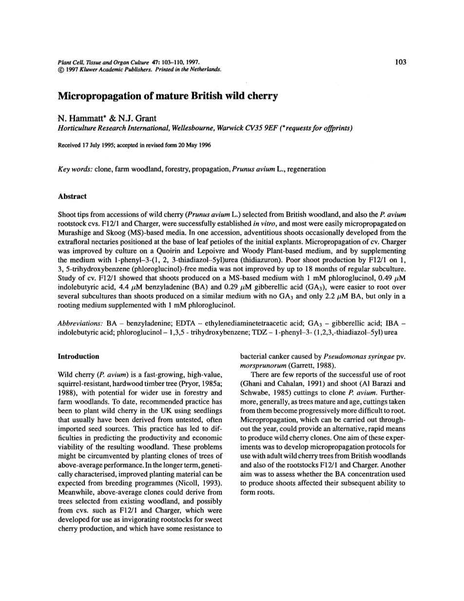 野樱桃(P.avium)是一个快速成长的,高价值,耐松鼠,硬木树(普赖尔,1985年,1988年),具有为林业和农业林地广泛应用的潜力。迄今为止,用推荐的做法在英国种植野樱的种子通常是从未经检验的且是进口的种子。这种做法已导致在预测生产力和所得到的林地经济可行性是有困难。这些问题可能通过种植克隆的良好的性能的树木被规避。从长期来看,基因特点,可以从育种计划(尼科尔,1993年)预期改进种植材料。同时,高于平均水平的克隆可以派生自现有的林地中选择的树木,以及可能从CVS。如F12/ 1和外植体,其被开发用于作为振兴砧木甜樱桃的生产,并具有抵抗由Pseudomonas syringae pv. morsprunorum(加勒特,1988)引起的细菌性溃疡病的能力。