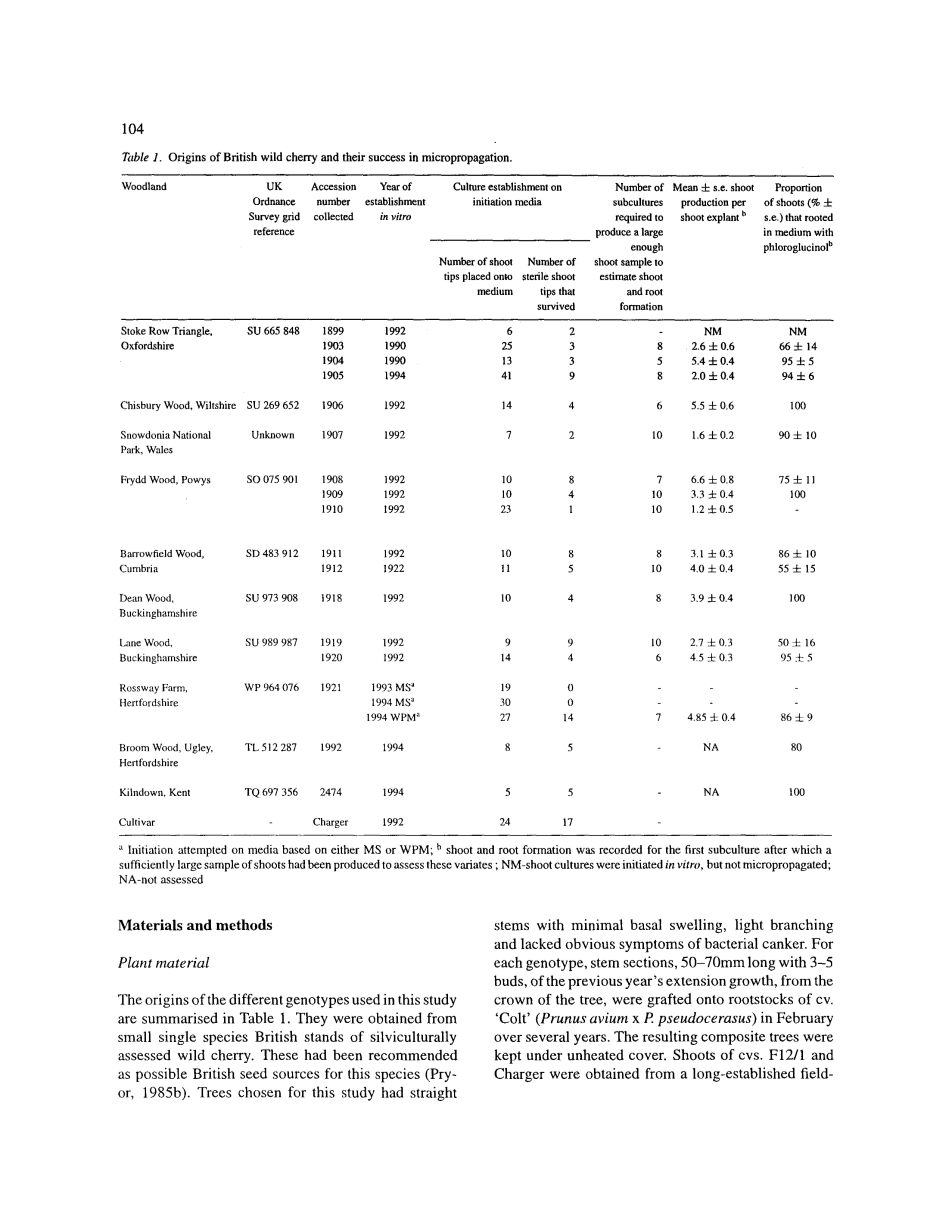 在这项研究中所用的不同基因型的起源总结于表1中。他们从小型单一物种的英国人工林里评估的林营野生樱桃获得的。这些已被推荐为这个物种的可能是英国的种源(普赖尔,1985年b)。本研究选择了树直具有最小基底肿胀,少分枝和缺乏细菌性溃疡病的明显症状。对于每个基因型,前一年的扩大生长的切段末端,从树的树冠,有50-70mm长的3-5个芽,被嫁接到栽培变种的砧木上。雄(Prunus avium x P. pseudocerasus)在数年内的二月,由此产生的复合树木被控制在未加热掩护下保存。 突变种的芽。从一个历史悠久的田间或得的F12/ 1和外植体,也嫁接到“雄”(1980年),并每年春天一直定期修剪。