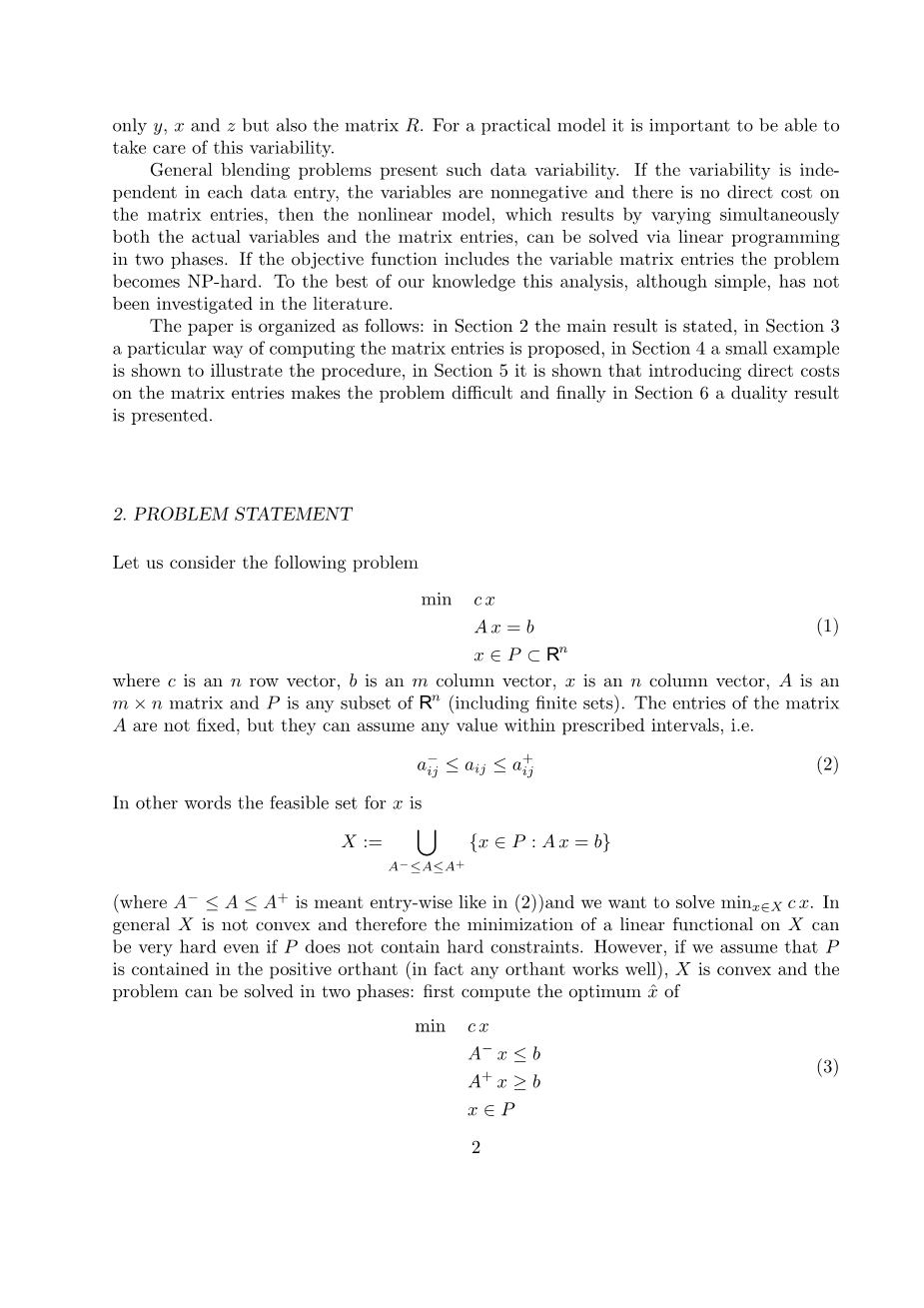 在本文中,我们处理了如下的情况:由于一些数据可以在引入决策参数之后固定到精确值。在这个意义上,我们选择引入参数,而不是直接处理这些变量。饮食问题(在[ 4 ]中同时也考虑到了区间数据)是这类问题的一个实例,它由营养物质(y),成分(x)、菜肴(z)组成。成分(x)和营养物质(y)代表的数据可以通过矩阵 联系在一起。成份(x)和菜肴(y)代表的数据都是通过矩阵组成的食谱联系在一起。变量z通常是整数,配方R中的数据通常可以在一定范围变化,并且不会影响这道菜的味道。因此,我们要考虑作为决策变量不只有Y,X和Z,还要考虑矩阵R,因为通过R可以很好的去帮助处理一些变异的数据。