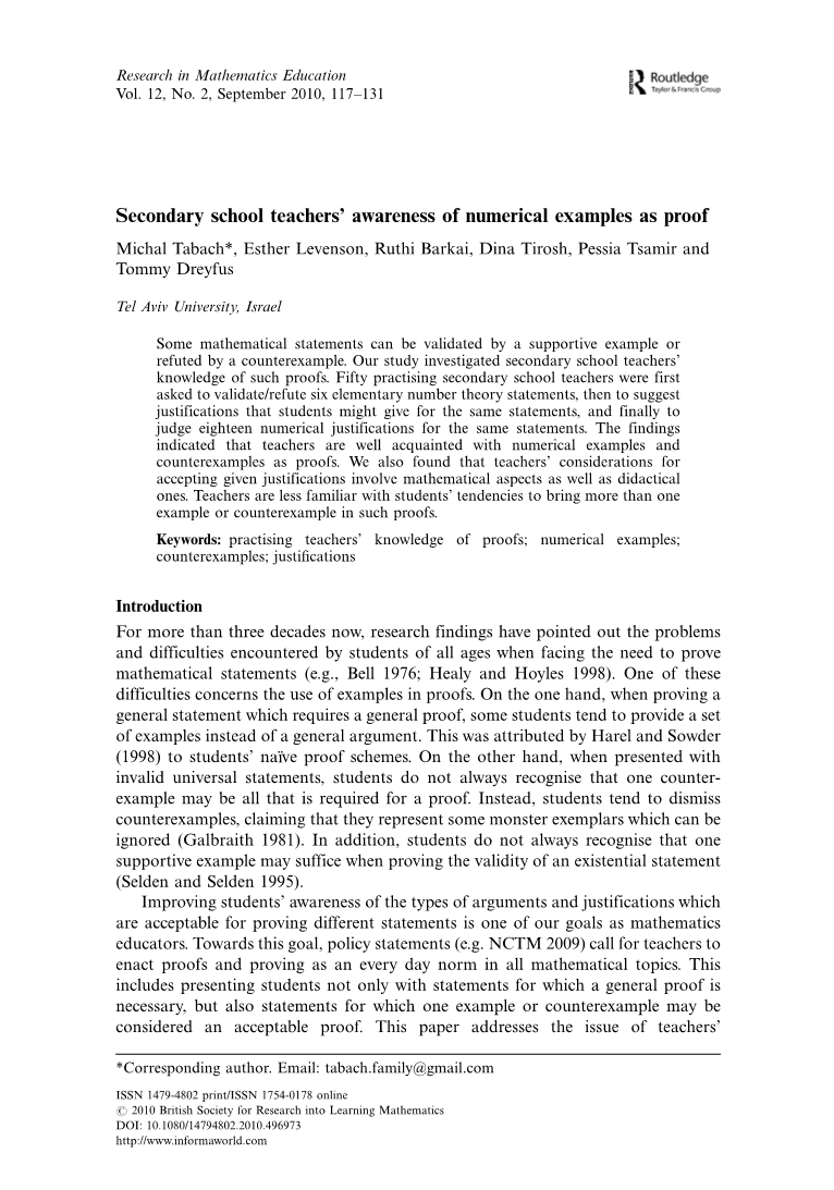 摘要:一些数学命题可以通过一个支持的例子或一个反例来验证。我们的研究调查了中学教师对作为证明的数值例子的意识。五十名中学教师首先被要求证明(反驳)了六个初等数论的命题,然后发表自己的观点。研究结果表明,教师是熟悉数值例子和反例证明的。我们还发现,教师能接受证明数值的例子考虑的是它涉及到了数学教学的方面。教师不熟悉的是学生更倾向于在证明中使用多个例子或者一个反例。