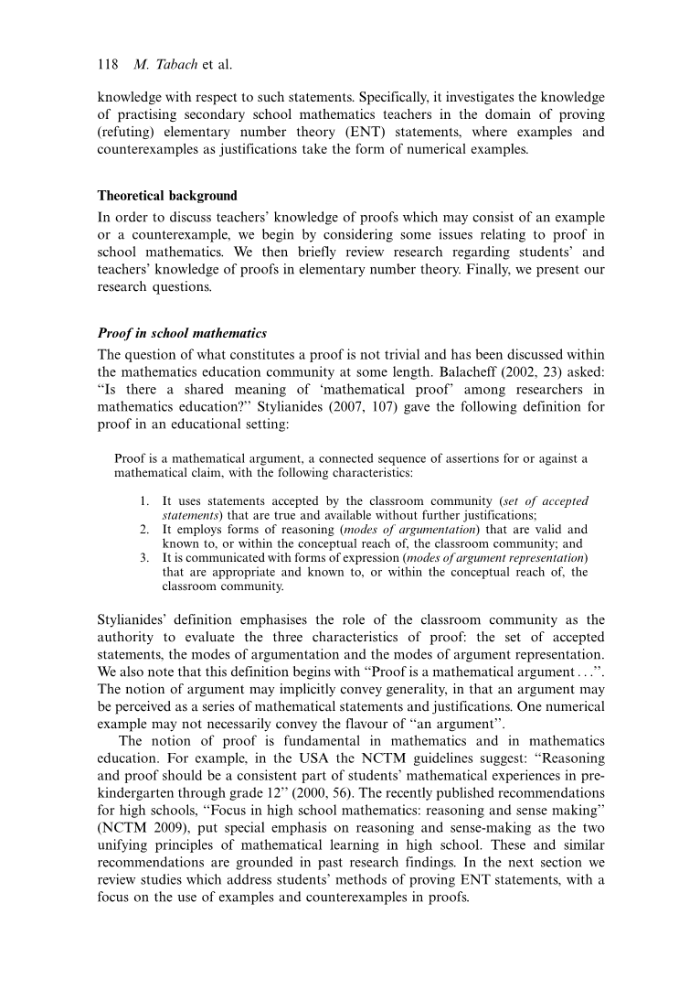 很少有研究去探讨教师关于ENT语句的证明的教学内容。然而,教师不仅要能够证明或反驳自己的陈述,还必须能够评价学生的证明。评价的标准不仅包括评价证明过程的正确性,同时还要看学生知识的掌握情况。例如Dreyfus (2000)发现一些教师,即使他们知道一个命题是正确的,却认为学生应该再多提供几个例子。教师也会评价命题的表示方式,说可以作为一个口头证据,虽然很有效,但却缺乏清晰的符号和代数证明。教师教学的另一个方面是他们对学生的偏见和误解。这包括,了解学生正确的和错误的证明过程。Tabach et al(2009)发现,一些中学教师不总是能够意识到这些方面。