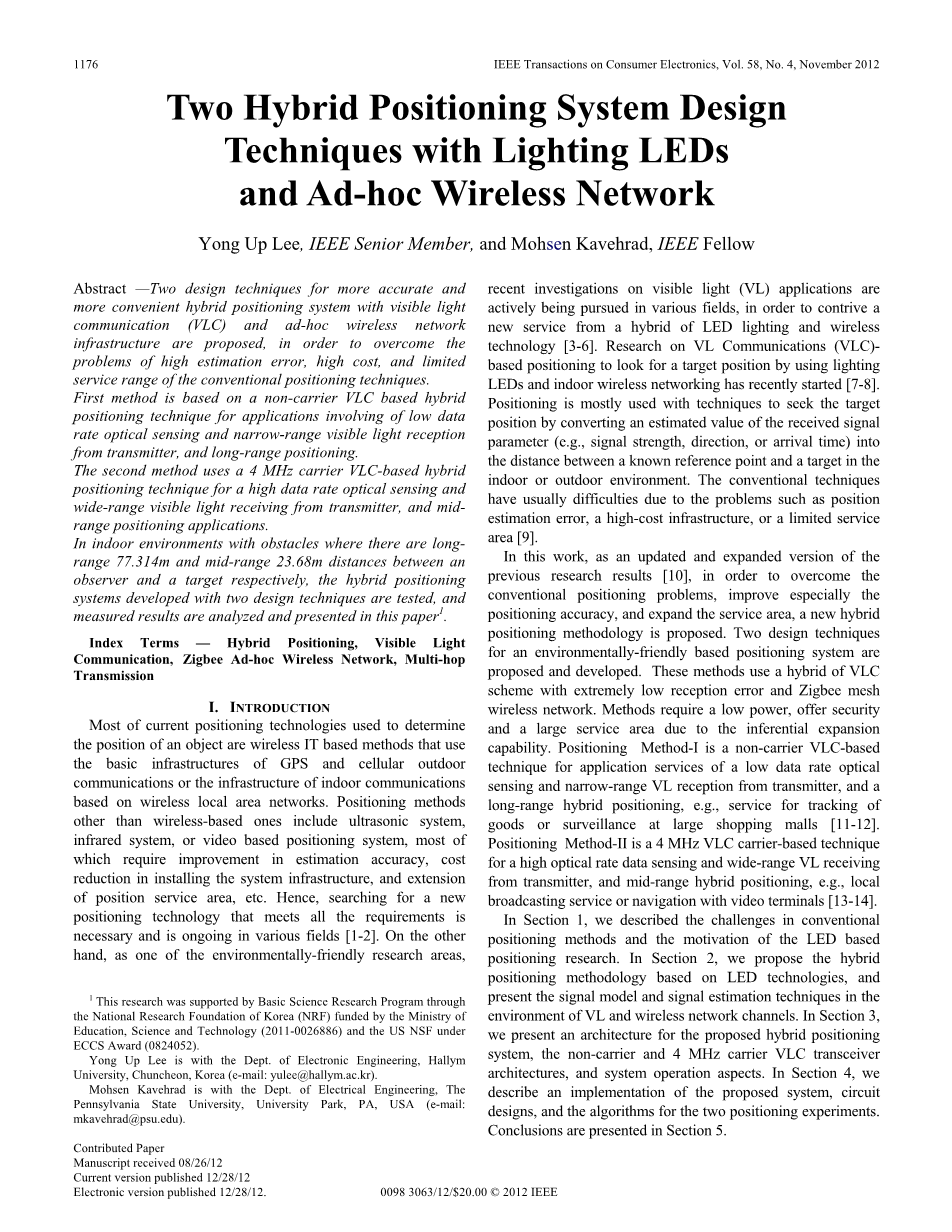 为了克服传统定位技术估计误差大,成本高,服务范围有限等问题,我们提出了两种设计方法,这两种方法将能更准确、更方便地服务于采用可见光通信(VLC)和ad-hoc无线网络基础设施的混合定位系统。
