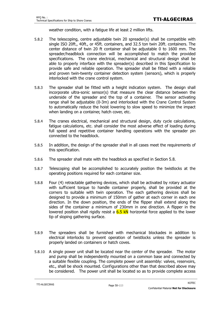 5.8.2 可伸缩式中心可调的双20英尺集装箱吊具可换装国际标准的单个20英尺、40英尺、45英尺和双20英尺32.5吨的集装箱。该吊具中心距离调节范围为0~1600mm,其头块的连接符合规范要求。起重机的电气、机械和结构设计应能够很好地与规范要求的吊具衔接以能够安全可靠地运行。集装箱吊具也应配备性能可靠地能够很好的和起重机控制系统互锁的集装箱检测设备。