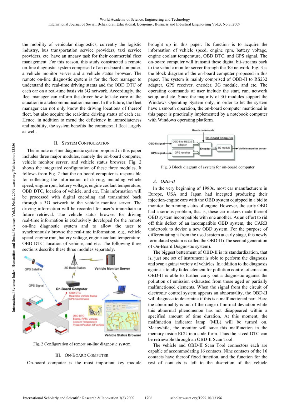 本文提出了一种远程在线诊断系统,该系统车辆基于故障诊断系统(OBD),GPS和3G技术。所提出的系统的主要部分是车载计算机,车辆监控服务器,一车辆状态浏览器。首先,车载计算机可以分别从GPS接收机和OBD接口状态获得车辆的驱动和定位。然后车载计算机将与车辆监控服务器连接,并通过3G网络传输实时车辆系统状态。最后,车辆状态浏览器可以显示远程车辆状态,包括车辆速度,发动机转速,电池电压,发动机冷却液温度,诊断故障码。根据实验结果,所提出的系统可以帮助车队经理和汽车门环了解远程车辆状态。因此,由于车队经理和汽车门环及时发现诊断问题,该系统可以减少车队管理和车辆维修的时间。