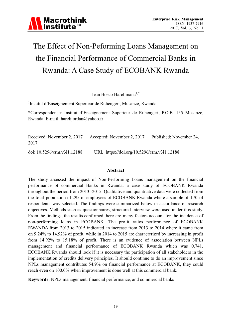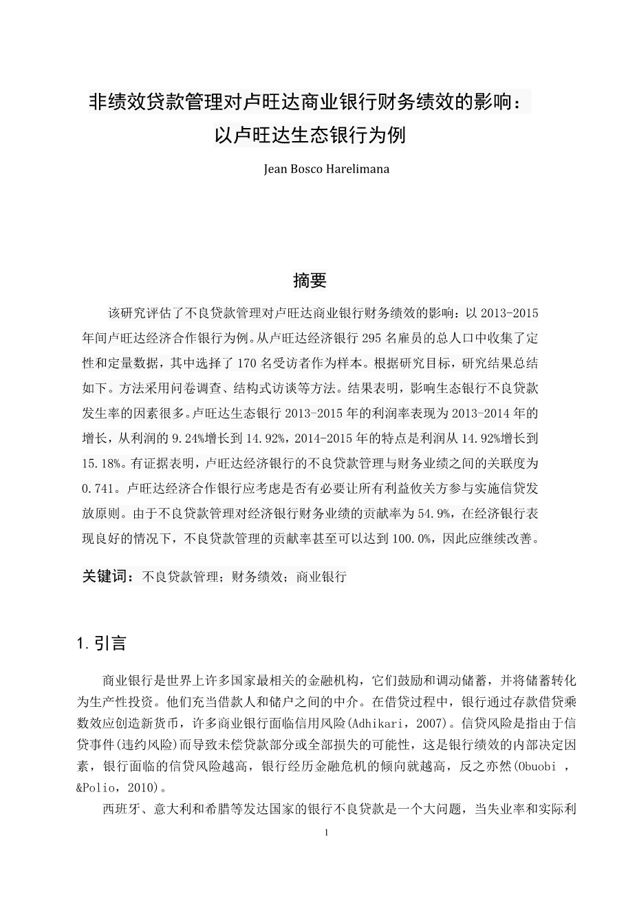 非绩效贷款管理对卢旺达商业银行财务绩效的影响: 以卢旺达生态银行为例外文翻译资料