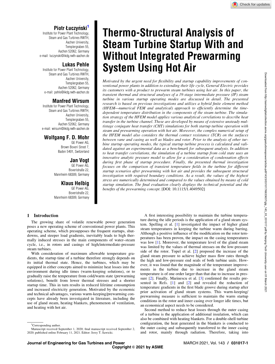 有无热风综合预热系统的汽轮机启动热结构分析外文翻译资料