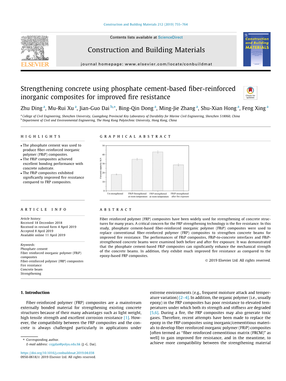 和温度变化)[2–4].此外,玻璃钢复合材料中的有机聚合物(通常为环氧树脂)对高温的抵抗力较弱,在高温下其强度和刚度均会降低[5,6].火灾时,FRP复合材料也可能产生有毒气体。因此,最近进行了尝试使用无机/胶结材料代替FRP复合材料中的环氧树脂,以开发纤维增强的无机聚合物(FRiP)复合材料[也常称为“纤维增强的胶结基质(FRCM)”]以获得改进的方法。耐火性,与此同时,实现增强材料之间的更多兼容性和混凝土基材[7–11].