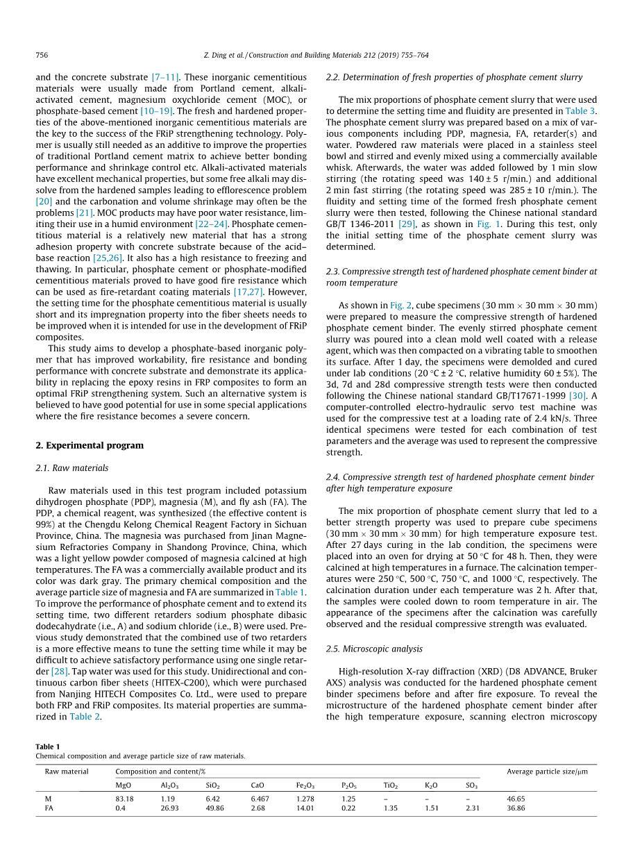 [20] 碳化和体积收缩通常可能是问题所在[21].MOC产品的耐水性可能很差,限制了它们在潮湿环境中的使用[22–24].磷酸胶凝材料是一种相对较新的材料,由于酸碱反应而与混凝土基材具有很强的粘合性能[25,26].它还具有很高的抗冻融性。尤其是,磷酸盐水泥或磷酸盐改性的水泥材料被证明具有良好的耐火性,可用作阻燃涂料。[17,27].然而,磷酸盐胶凝材料的凝固时间通常很短,并且当其打算用于开发FRiP复合材料时,需要改善其在纤维片材中的浸渍性能。