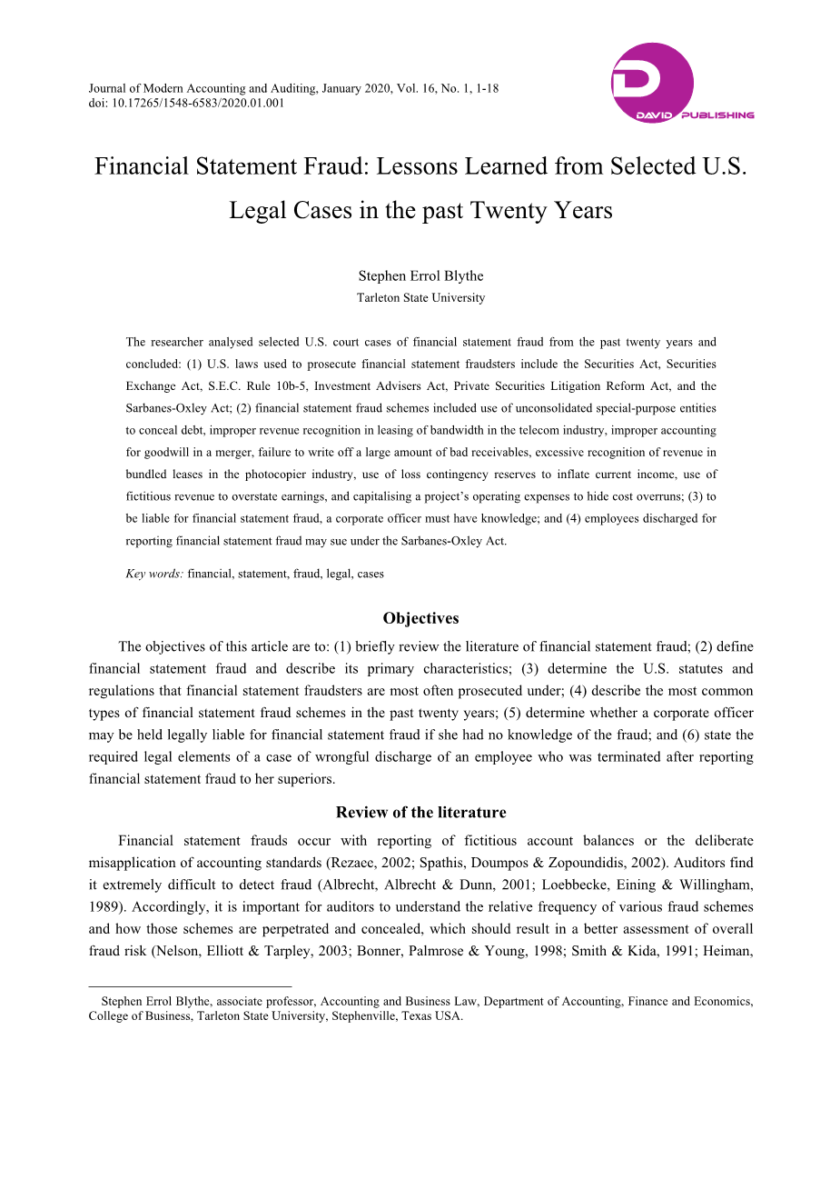 Financial Statement Fraud: Lessons Learned from Selected U.S. Legal Cases in the past Twenty Years