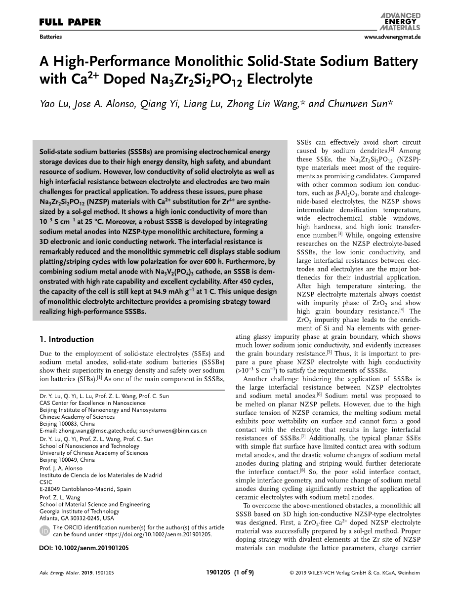 由于固态钠电池具有高的能量密度,高的安全性能和丰富的钠资源,固态钠电池是具有应用前景的电化学储能装置。但是,固态电解质中的低电导率以及电解质与电极之间的高的界面电阻是其在实际应用的两大主要挑战。为了解决这些问题,可以通过溶胶—凝胶法合成具有使得Ca2 取代Zr4 进而得到纯相的Na3Zr2Si2PO12(NZSP)的材料。这可以使在25 ℃时,其离子电导率超过10-3 S cm-1。此外,一种被开发的稳定的固态钠电池通过将纳金属阳极集成到NZSP型的单片结构中,形成三维电子传导和离子传导网络结构。界面电阻显著减小,垫片对称电池在600小时以上的低级化情况下表现出稳定的钠盘/条带循环。再者,通过金属钠阳极与Na3V2(PO4)3阴极的结合,表明了固态钠电池具有高速率能力和杰出的循环性能。在循环了450个周期后,在1C下,该电池的容量仍然保持在94.9 mAh g-1,这种独特的单片电解质体系结构设计为实现高性能的固态钠电池提供了一种有前景的方法。