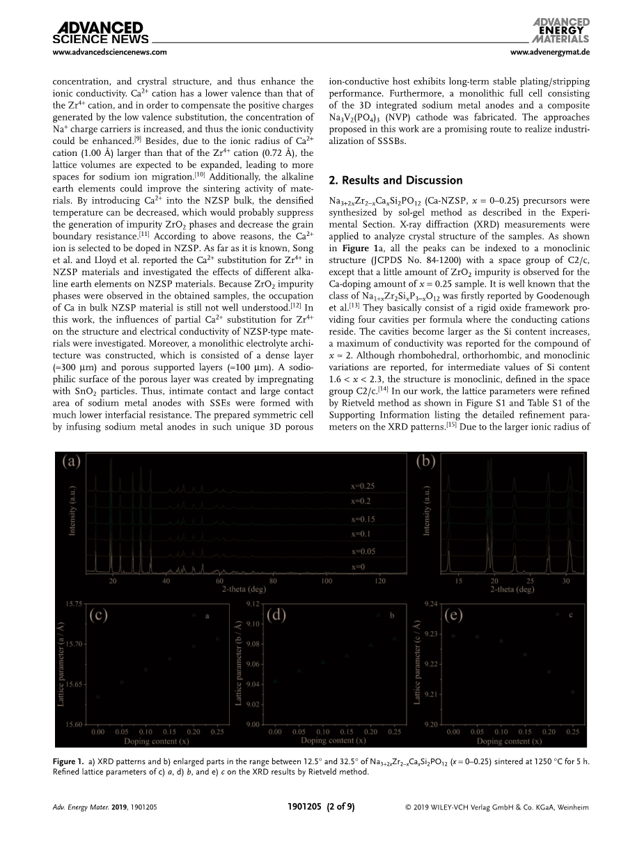 为了克服上述提及的障碍,设计了一种基于3D高的离子导电性能的NZSP型电解质的单片固态钠电池。第一,采用溶胶-凝胶法成功地制备出一种Ca2 取代部分ZrO2中的Zr4 的NZSP电解质材料。二阶元素NZSP材料Zr位点上采用适当的掺杂方式可以调节晶格参数,电荷载流子浓度,晶体结构,从而提高离子电导率。Ca2 离子价态比Zr4 离子价态低,为了补偿低价态会产生正电荷,Na 载流子浓度增加,从而提高了离子电导率。此外,由于Ca2 半径(1.00 Aring;)大于Zr4 半径(0.72 Aring;),预计其晶格体积将会变大,导致钠离子的迁移空间增大。此外,碱土元素可以提高烧结活性。通过将Ca2 引入NZSP体中,可以降低致密温度,这可能会抑制杂质ZrO2晶相的生成,减少晶界电阻。根据以上原因,选择Ca2 掺杂于NZSP体中。据了解Song等人和Lloyd等人,报道了在NZSP材料中Ca2 取代Zr4 ,考察了不同碱土元素对NZSP材料的影响。由于ZrO2杂质相是在获得的样品中观察到的,故对Ca在块状NZSP材料中的占比还不是很清楚。本实验,研究了Ca2 取代部分ZrO2中的Zr4 对NZSP型材料的结构和电导率的影响。此外,单一的电解质体系结构组成是由一个致密层(asymp;300 mu;m)和多孔支撑层(asymp;100 mu;m)构成。多孔层的亲水层表面是通过浸渍SnO2粒子而形成的。因此,金属钠阳极与固态电解质形成的紧密和大面积接触,使界面电阻大大降低。在这种独特的3D多孔离子导电基质中注入金属钠阳极制备的对称对称电池具有长期稳定的电镀/剥离性能。在此基础上,制备了3D集成的金属钠阳极和复合的NZSP阴极所组成的单片全电池。本文提出的方法,是实现固态钠电池产业化的有前景的方法。