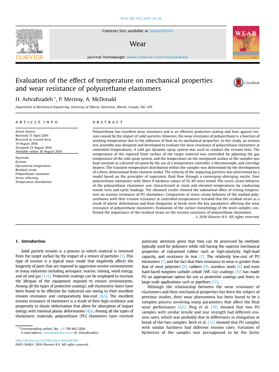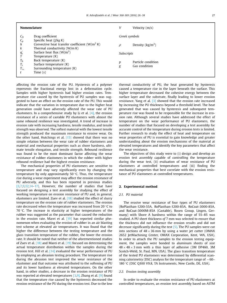 聚氨酯弹性体的机械性能对温度敏感,即使只改变大约50酯弹的温度,也可能会发生显著变化。因此,磨损试验期间的温升可能会对聚氨酯的抗冲蚀性产生不利影响,这已在先前的研究中报告过[3,7,9,12,14变化。因。然而,研究工作温度对聚氨酯(PU)和一般弹性体抗冲蚀性能影响的试验装置的数量有限。Zuev等人。[18] 研究了浆体温度对橡胶弹性体冲蚀速率的影响。当温度从20了浆提高到70到浆时,橡胶的冲蚀率降低。建议将橡胶在较高温度下的弹性增加作为导致冲蚀率降低的参数。Marei等人。[19] 报道了在高温空气爆破试验方案中评估橡胶腐蚀时的类似现象。结果表明,试验温度与玻璃化转变温度差越大,橡胶的冲蚀率越低。应当指出的是,上述两项对Zuev等人的研究都没有。[18] 以及Marei等人。[19] 重点是确定腐蚀试验过程中样品内部的实际温度分布。希尔等人。[14] 采用磨损试验方法评价聚氨酯的磨损性能。磨损试验中的温升提高了弹性体的耐磨性,这归因于PU的软化和高温下较低的硬度。另一方面,在其他研究中,报道了PU在高温下的抗侵蚀性降低[3,9]。Zhang等人。[9] 在冲蚀试验中发现,由于迟滞引起的温升降低了PU的抗冲蚀性能。由于PU的导热系数较低,由迟滞产生的热量使其表面下的温度升高。较高的温度降低了表层与基体之间的结合能,最终导致了较低的抗冲蚀性能。Yang等人。[3] 结果表明,PU厚度越大,冲蚀速率越大。由磁滞和随后的温升所产生的热量被认为是腐蚀速率增加的原因。虽然有几项研究已经讨论了温度对聚氨酯弹性体磨损性能的影响,但集中在开发一个试验装置以在冲蚀试验期间精确控制温度的研究数量有限。进一步研究热和温度对PU耐磨性能的影响,对于深入了解PU材料高温冲蚀机理,确定影响PU耐磨性能的关键参数具有重要意义。