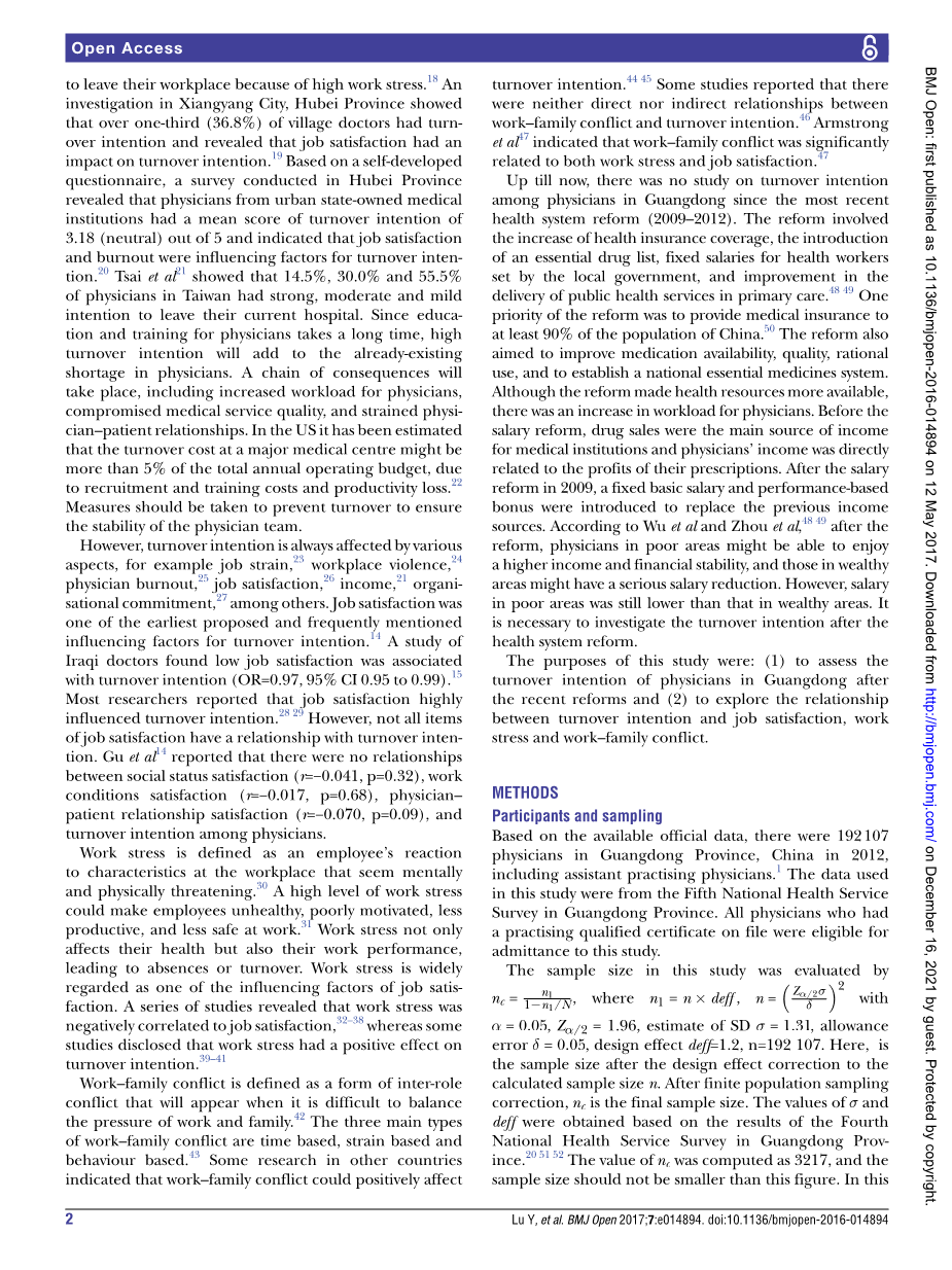 中国广东医生的满意度、工作压力、工作家庭冲突和离职倾向:一项横断面研究。2017年BMJ公开赛;7:e014894doi:10.1136/