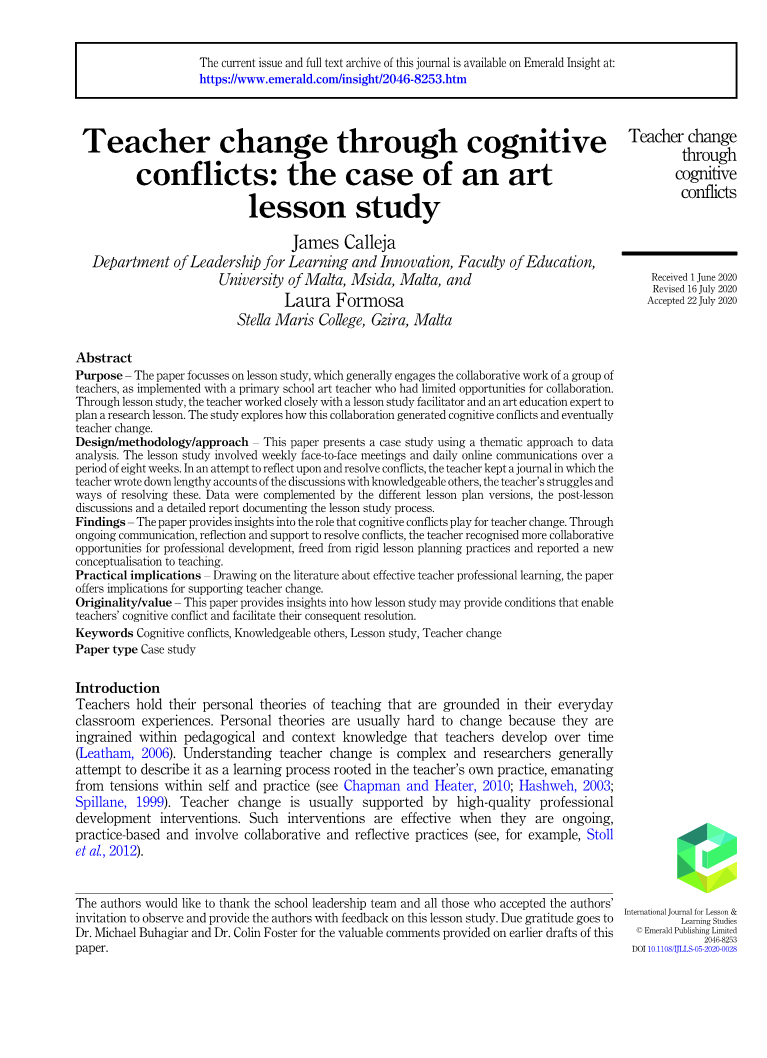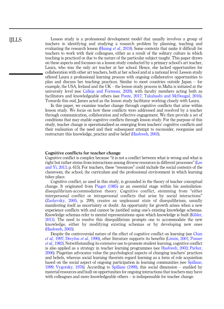 在本文中,我们通过课程研究中出现的认知冲突来研究教师变革。我们关注的是教师如何通过交流、合作和反思参与来处理和解决这些冲突。然后,我们提供了一系列条件,这些条件可以通过课程研究来实现认知冲突。在本研究中,教师变革被理解为来自于教师的认知冲突,以及他们意识到的需求以及他们随后试图重新考虑、重组和调整这种知识、实践和/或信仰的尝试(Hashweh, 2003)。