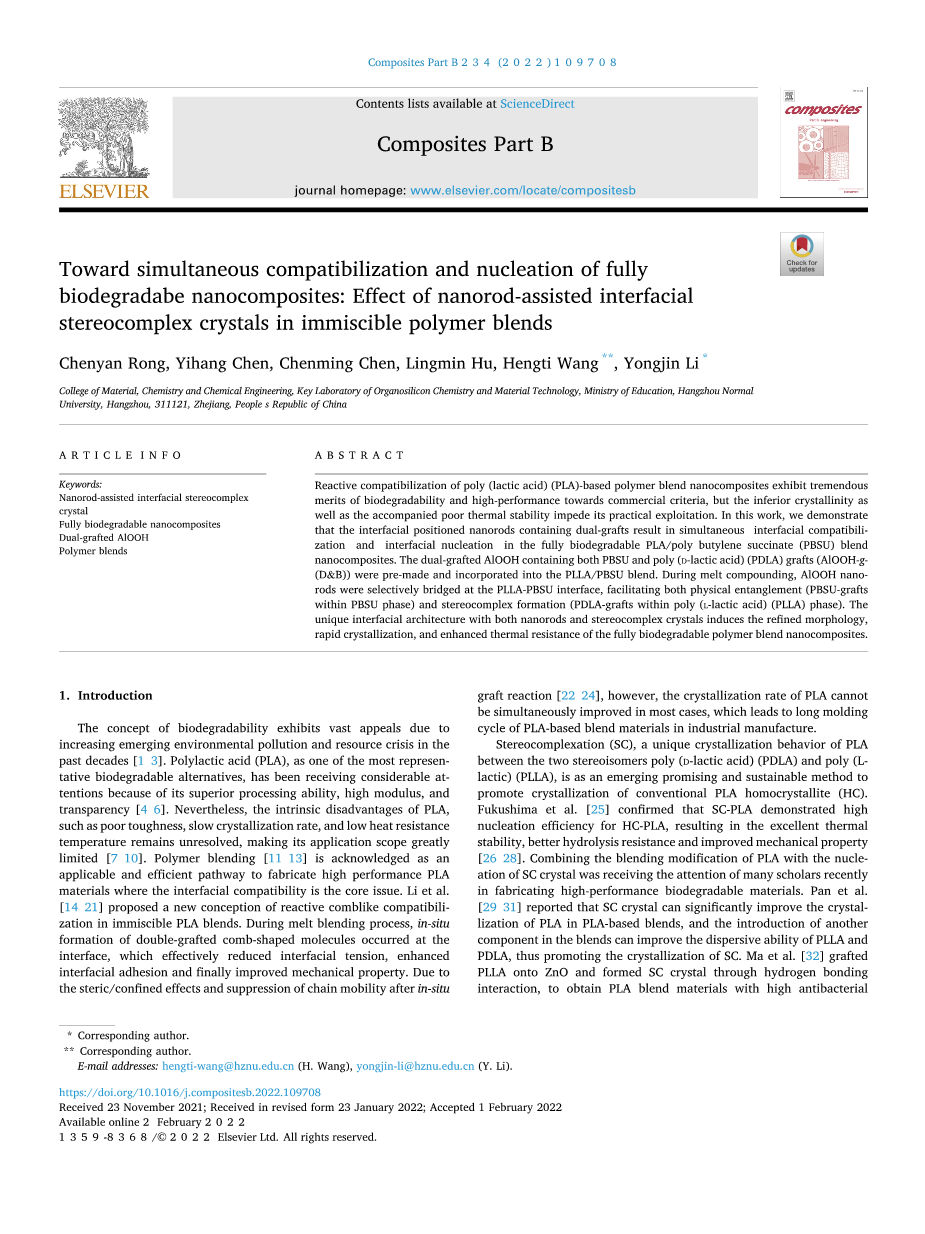 摘要:利反应性加工技术能够实现聚乳酸(PLA)基共混纳米复合材料的高性能化,受到长期关注。然而,复合材料仍存在结晶度低和热稳定性差的缺点,阻碍其实际应用。本项文中,我们通过反应性共混形成双接枝型纳米棒,它能够有效稳定于两相界面,同时实现“界面增容”和“界面成核”,为制备全生物可降解的PLA/聚丁二酸丁二醇酯(PBSU)共混纳米复合材料中提供新思路。具体如下:预先制备含有PBSU和左旋聚乳酸(PDLA)接枝链(AlOOH-g-(Damp;B))的双接枝勃姆石纳米棒,并将其引入PLLA/PBSU共混体系中。在熔融共混过程中,勃姆石纳米棒被选择性地稳定于PLLA-PBSU界面,促进了物理缠结(PBSU相与PBSU接枝链)和立构复合晶的形成(右旋聚乳酸(PLLA)相与PDLA接枝链)。纳米棒和立构复合晶的独特界面结构实现了完全可生物降解的聚合物共混纳米复合材料的细化形态、快速结晶和优异的耐热性。