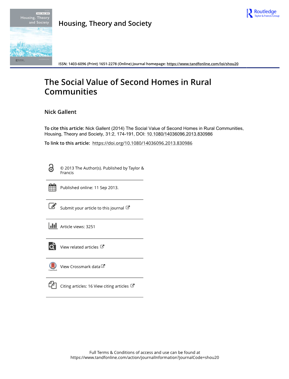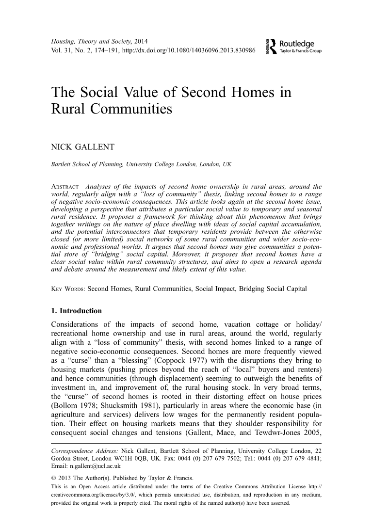 摘要:对世界各地农村地区拥有第二套住房的影响的分析,通常与“社区丧失”的论点相一致,并且将第二住宅与一系列消极的社会经济后果联系在一起。本文再次审视第二住宅的问题,提出了一种将临时性和季节性的农村住宅赋予特定社会价值的观点。它提出了一个思考这一现象的框架,将关于地方居住性质的著作与社会资本积累的思想结合起来,临时居民在一些农村社区封闭(或更有限)的社会网络与更广泛的社会经济和职业世界之间提供了潜在的联系。它认为,第二套住房可能为社区提供一个潜在的“桥梁”。此外,它提出第二住宅在农村社区结构中具有明确的社会价值,并旨在围绕这一价值的测量和可能的程度展开研究议程和辩论。