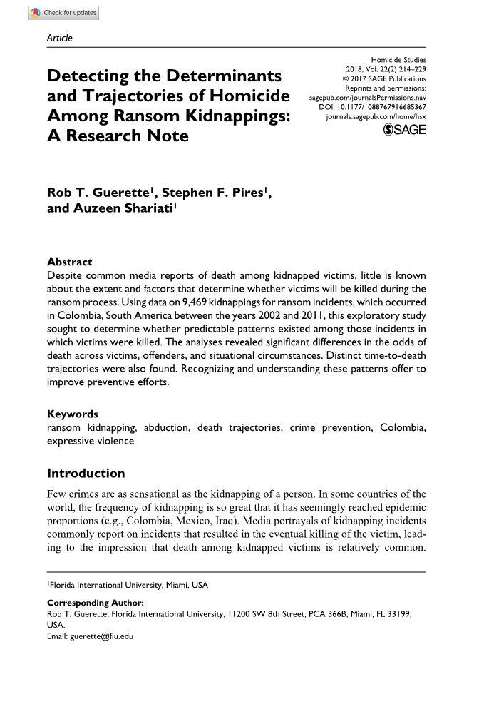 摘要:尽管媒体普遍报道被绑架的受害者死亡,但人们对此知之甚少关于决定受害者是否会在战争期间被杀害的程度和因素赎金程序。利用发生的9469起绑架勒索事件的数据2002年至2011年间,在南美洲哥伦比亚,这项探索性研究试图确定这些事件中是否存在可预测的模式哪些受害者被杀了。分析结果显示,两组患者的死亡率存在显著差异受害者、罪犯和情境中的死亡。明确的死亡时间还发现了轨迹。认识和理解这些模式有助于改进预防工作。