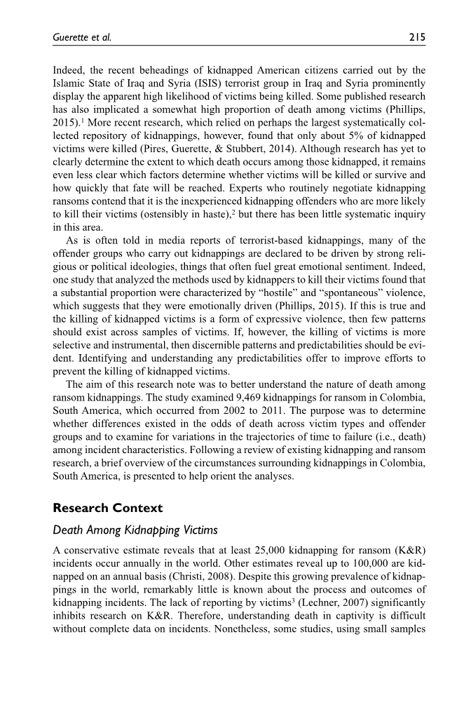 情境的变数表明,集体绑架的受害者经历的风险降低了33%死亡几率,以及在农村被绑架的人被杀害的几率增加了53%。这项研究为绑架的性质提供了独特的见解受害者中的凶杀案了解受害者、罪犯和情境环境中的死亡概率,无论他们是在哥伦比亚还是在世界其他国家,提议改进预防工作。虽然最好的方案是减少Kamp;R绑架发生的机会(见Pires等人,2014年),几乎没有犯罪预防措施被证明是绝对的,因此绑架将继续。下一步就是要发展强大的手段和方法来减少被拘留者的死亡俘虏。