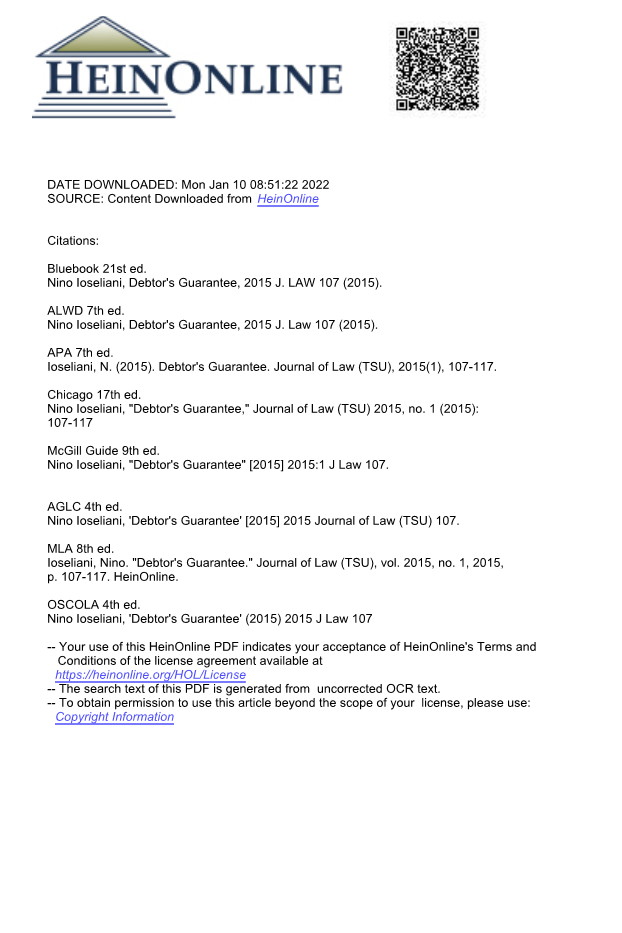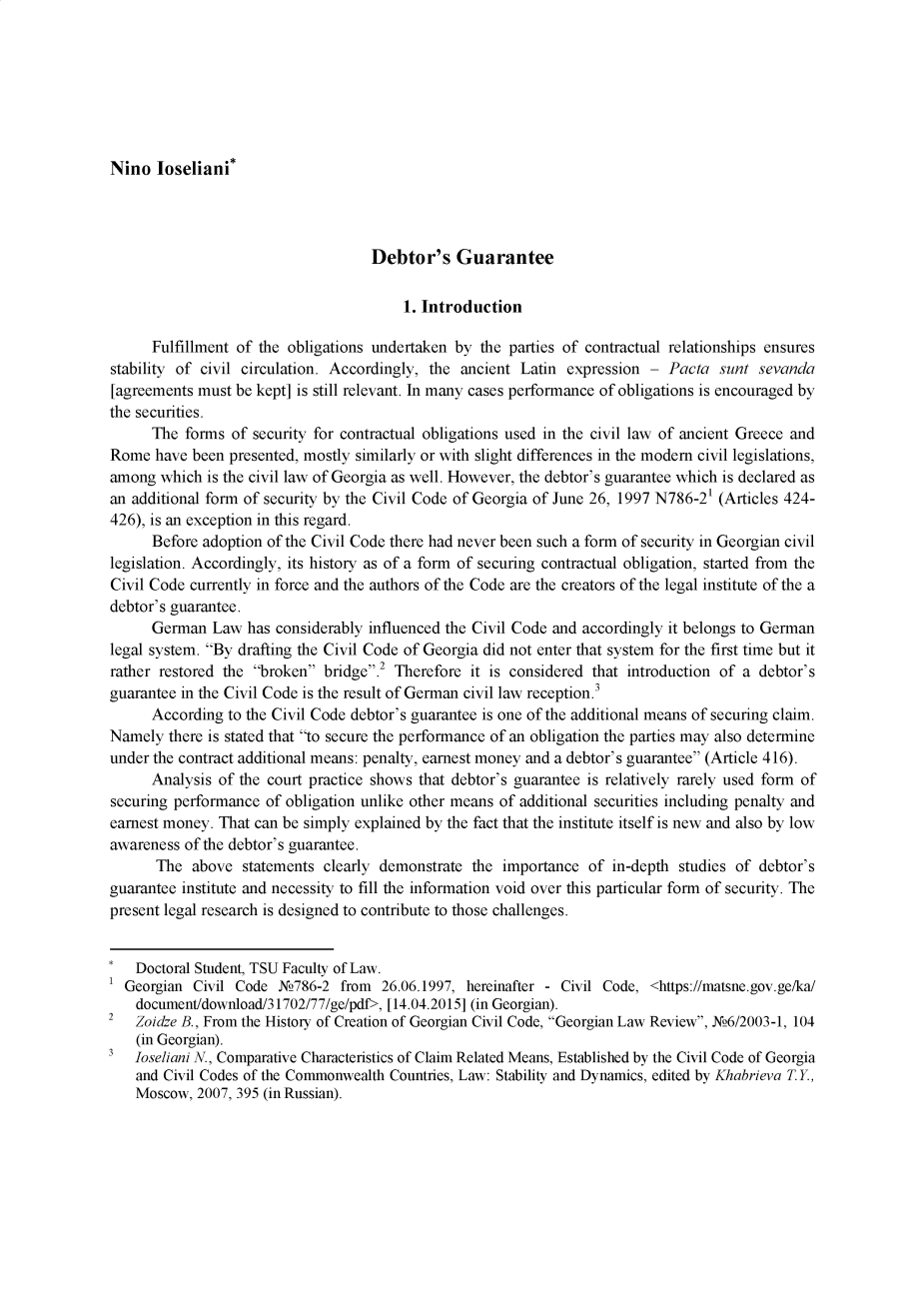 已经介绍了古希腊和罗马民法中使用的合同义务担保形式,这些形式在现代民法中大致相似或略有不同,其中也包括格鲁吉亚的民法。但是,1997年6月26日《格鲁吉亚民法典》第786-2i条(第424-426条)宣布为附加担保形式的债务人担保在这方面是一个例外。
