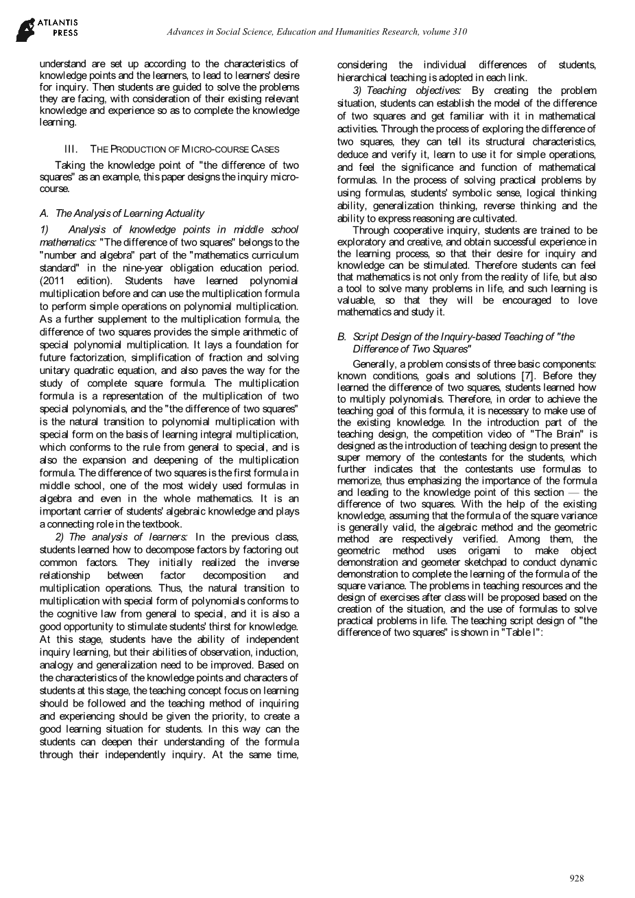 出处:Maochun Yu.Research on the Micro-course Design of Situational Inquiry Teaching of Middle School Mathematics Taking the Difference of Two Squares as an Example;Proceedings of the 3rd International Conference on Culture, Education and Economic Development of Modern Society (ICCESE 2019);April 2019;2352-5398